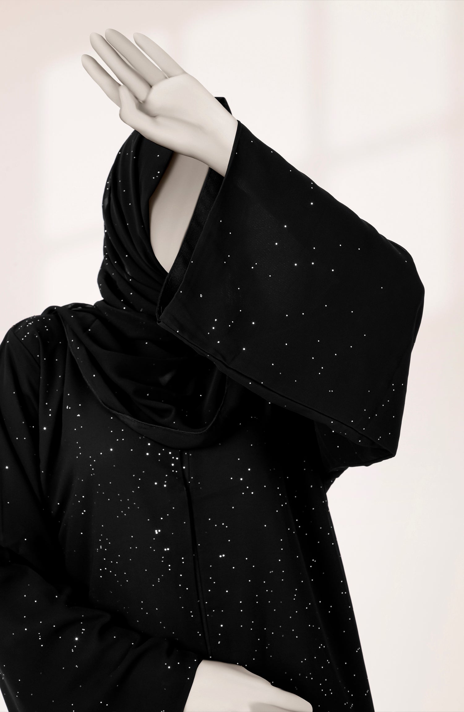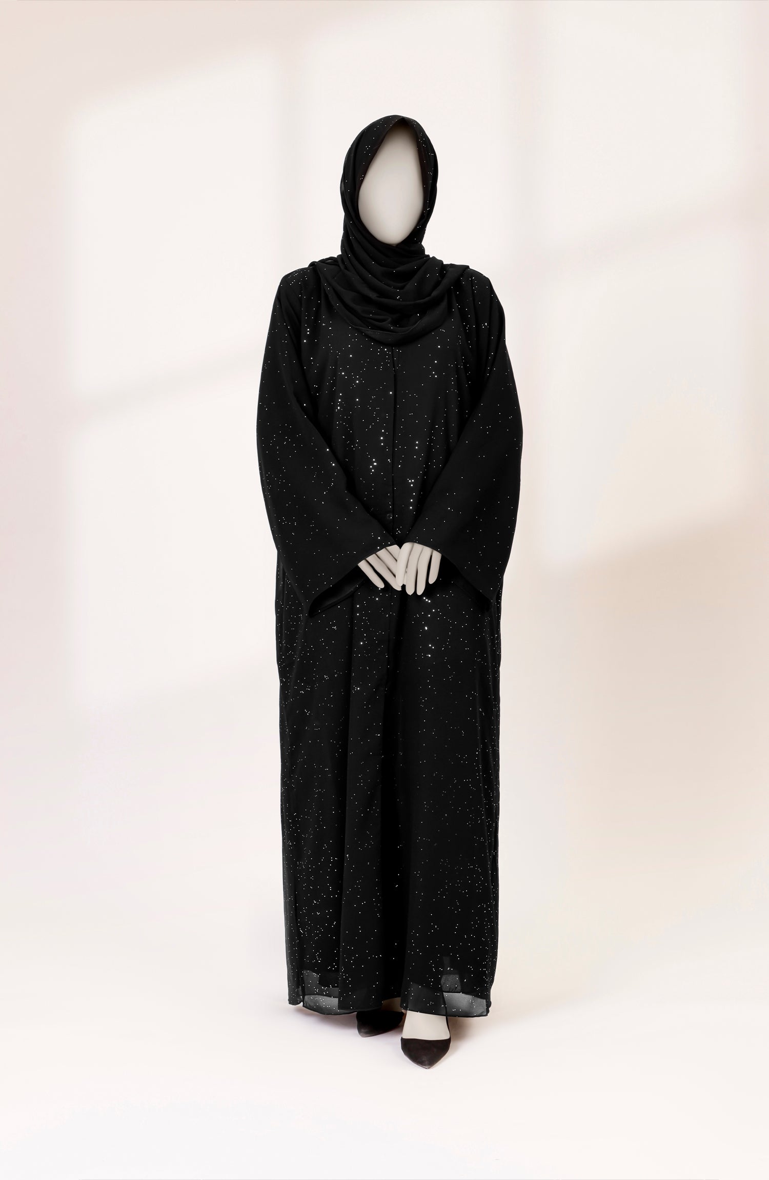 This elegant abaya is crafted from black chiffon with subtle glitter, adding a refined shimmer to its lightweight, double-layer design. Featuring a front-open style with convenient buttons and a matching scarf, it’s easy to wear and perfect for summer events like weddings & evening occasions. This abaya effortlessly combines comfort and elegance, making it a standout addition to your formal wardrobe.
