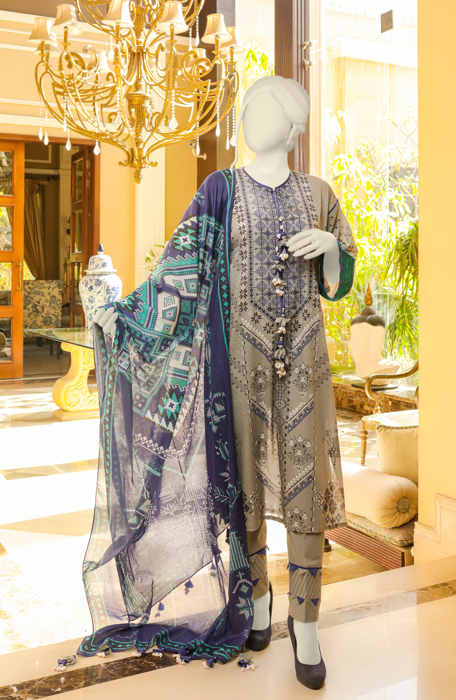Embroidered digital printed lawn shirt with digital printed lawn dupatta and solid dyed pants