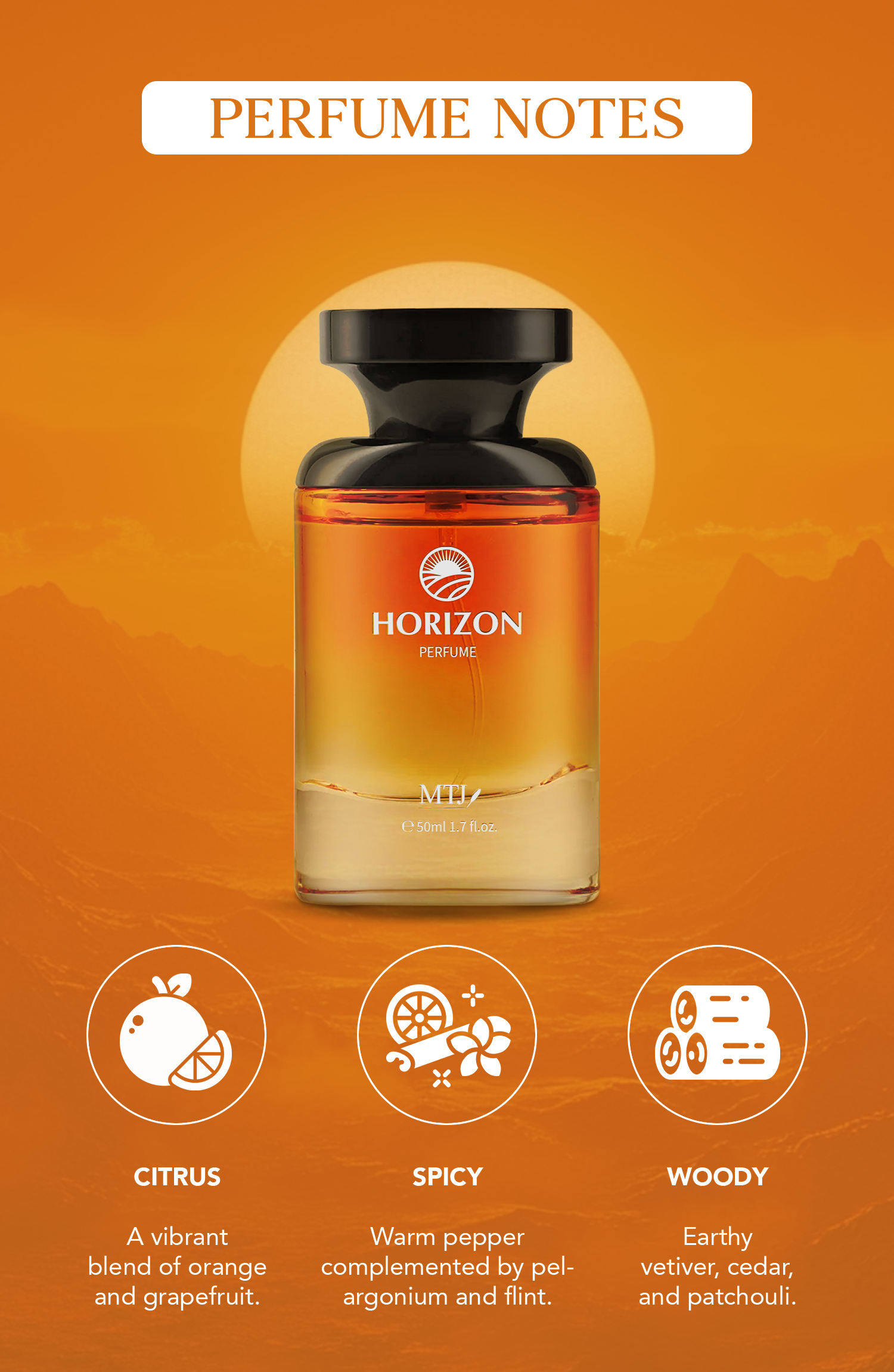 Horizon, a captivating men's fragrance that embodies the spirit of adventure and the allure of the unknown. This woody spicy scent is crafted to take you on a journey through bold, invigorating notes that reflect strength, confidence, and refinement.