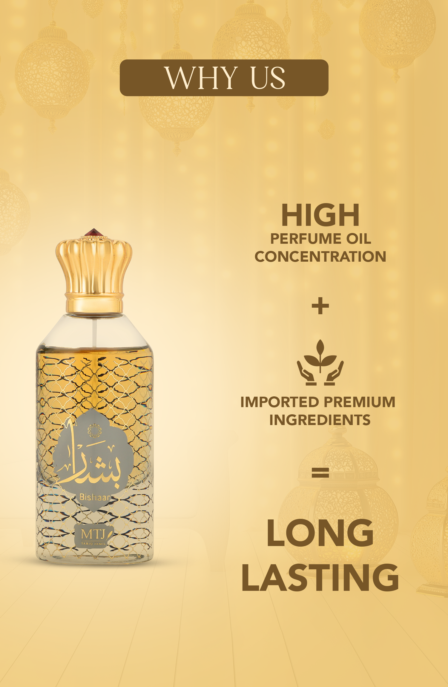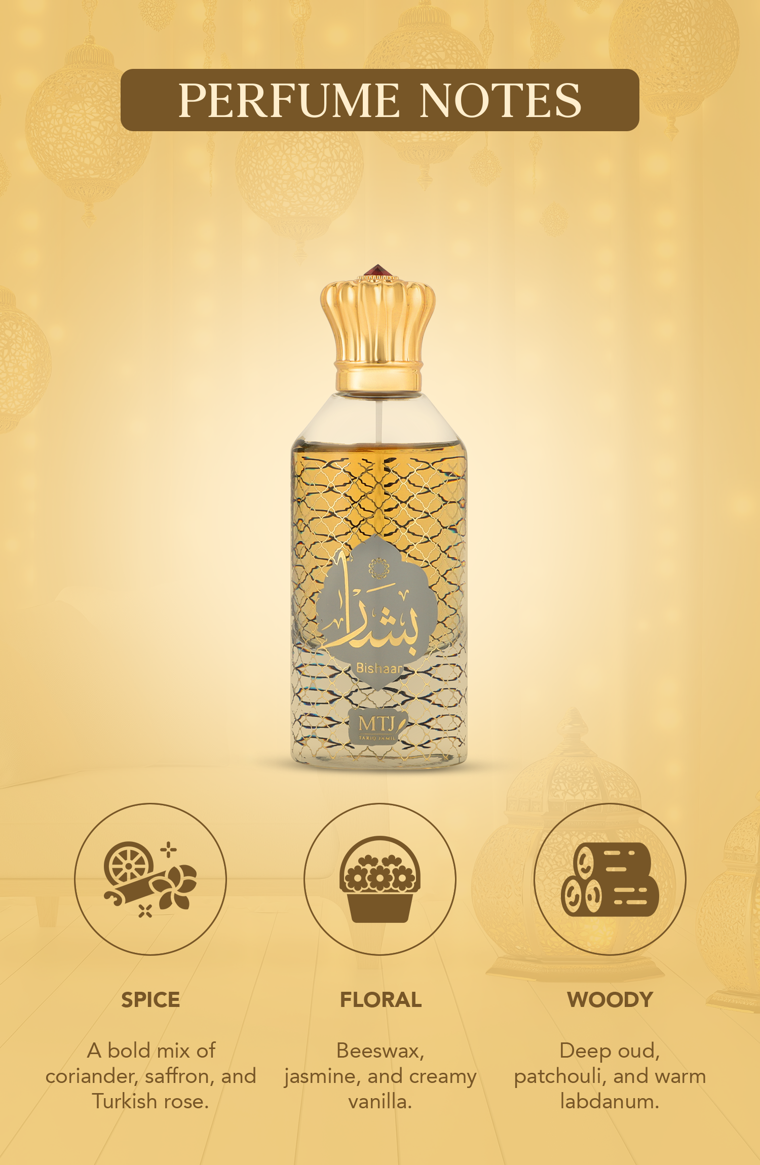 Welcome to the world of MTJ Fragrances, where every scent is a story waiting to be told and every fragrance is a journey of sensory delight. With a rich heritage in crafting exceptional perfumes, MTJ Fragrances is a name synonymous with elegance, luxury, and the art of olfactory expression. MTJ Bishaar, inspired by the ecstatic feeling of receiving good news. An enveloping and addictive fragrance. Rich with emotion and encased in powdery, creamy warmth, it echoes a comforting embrace full of inner gratitude. Turkish rose and warm saffron dance joyfully around one another as they open the fragrance. The heart beats of diffusive white flowers lacquered in balsamic vanilla - teasing the senses. Rich Labdanum and refined patchouli undertones enhance the hypnotic oud, creating a symphony of passionate joy.