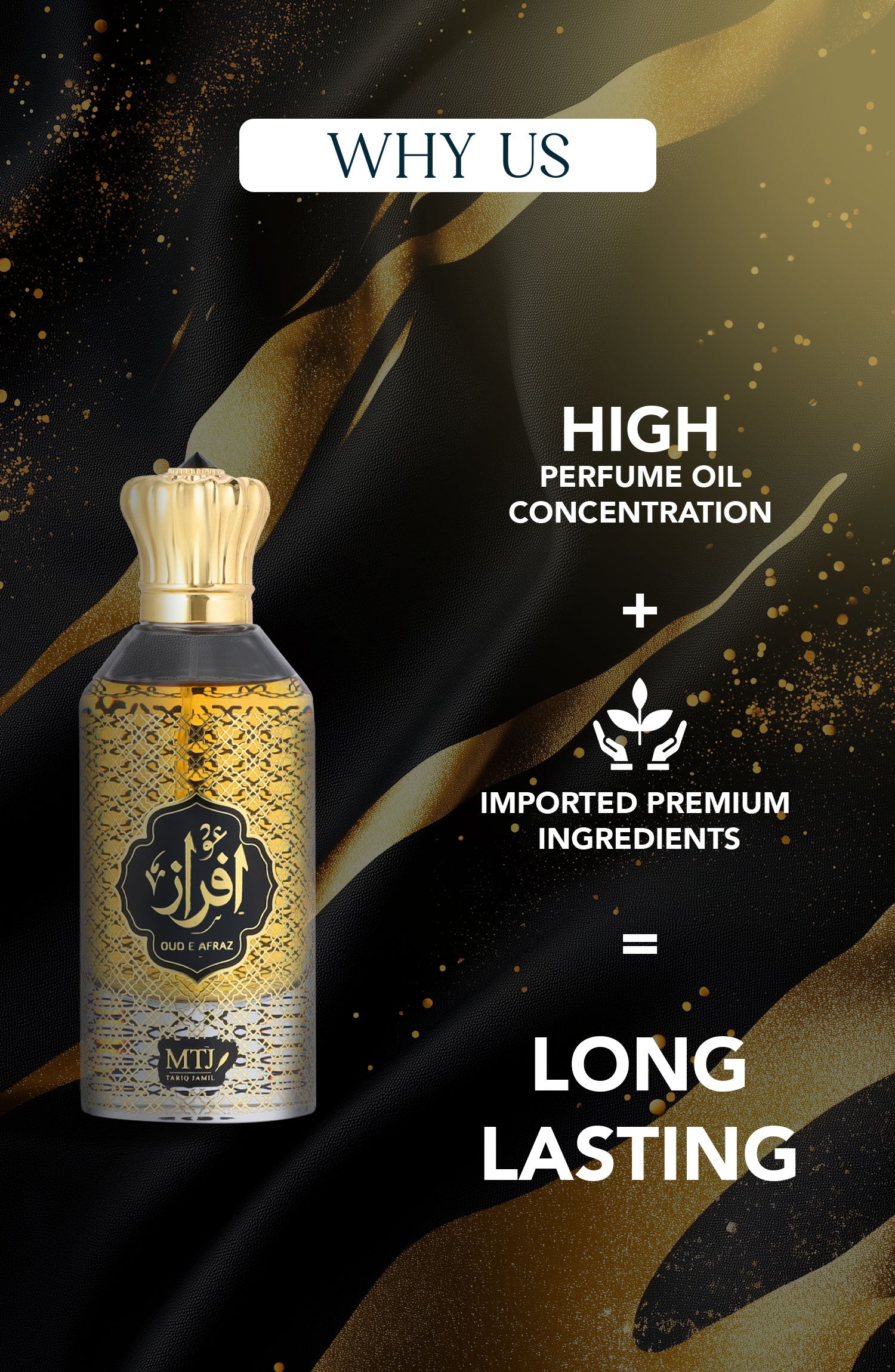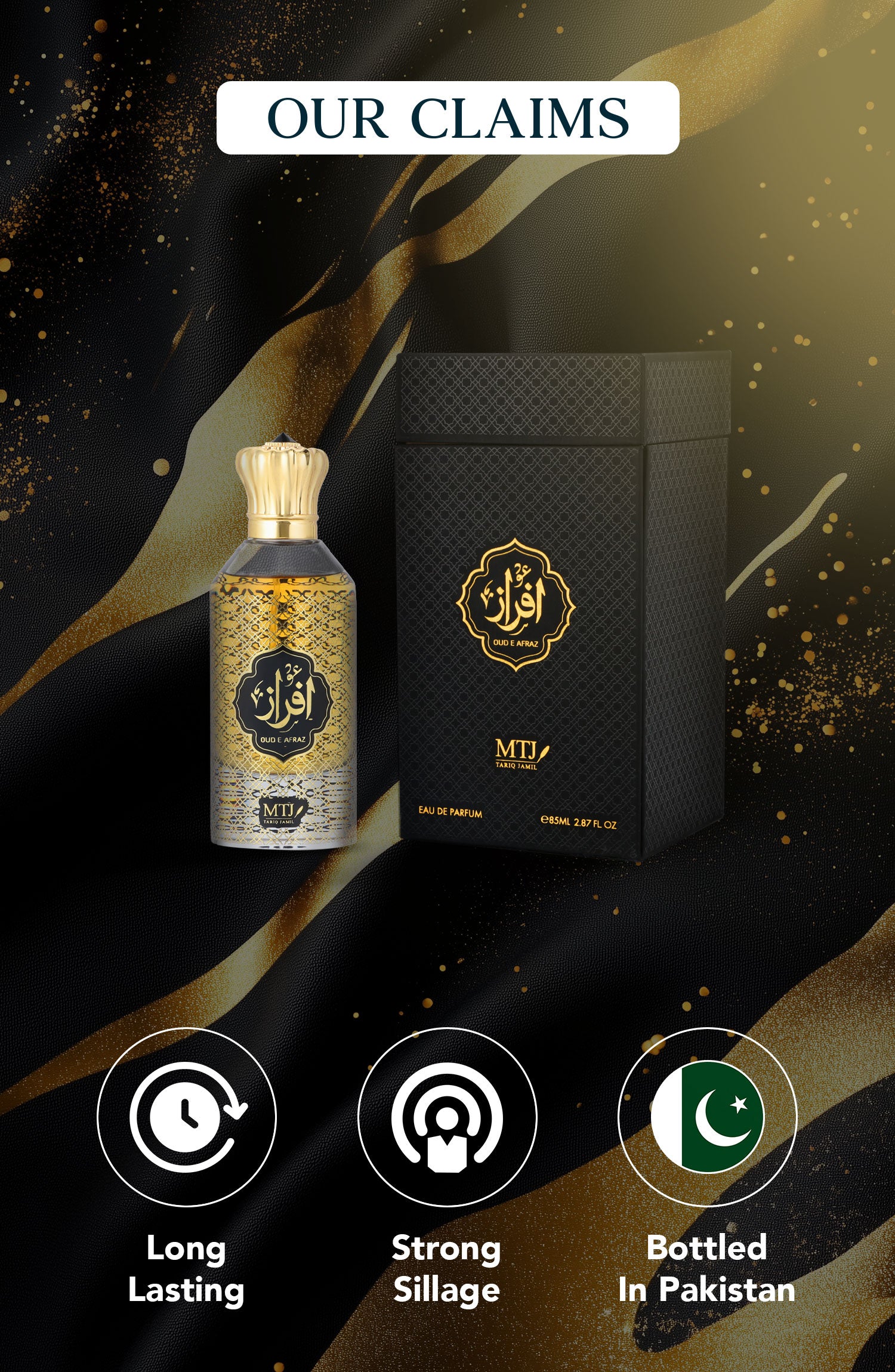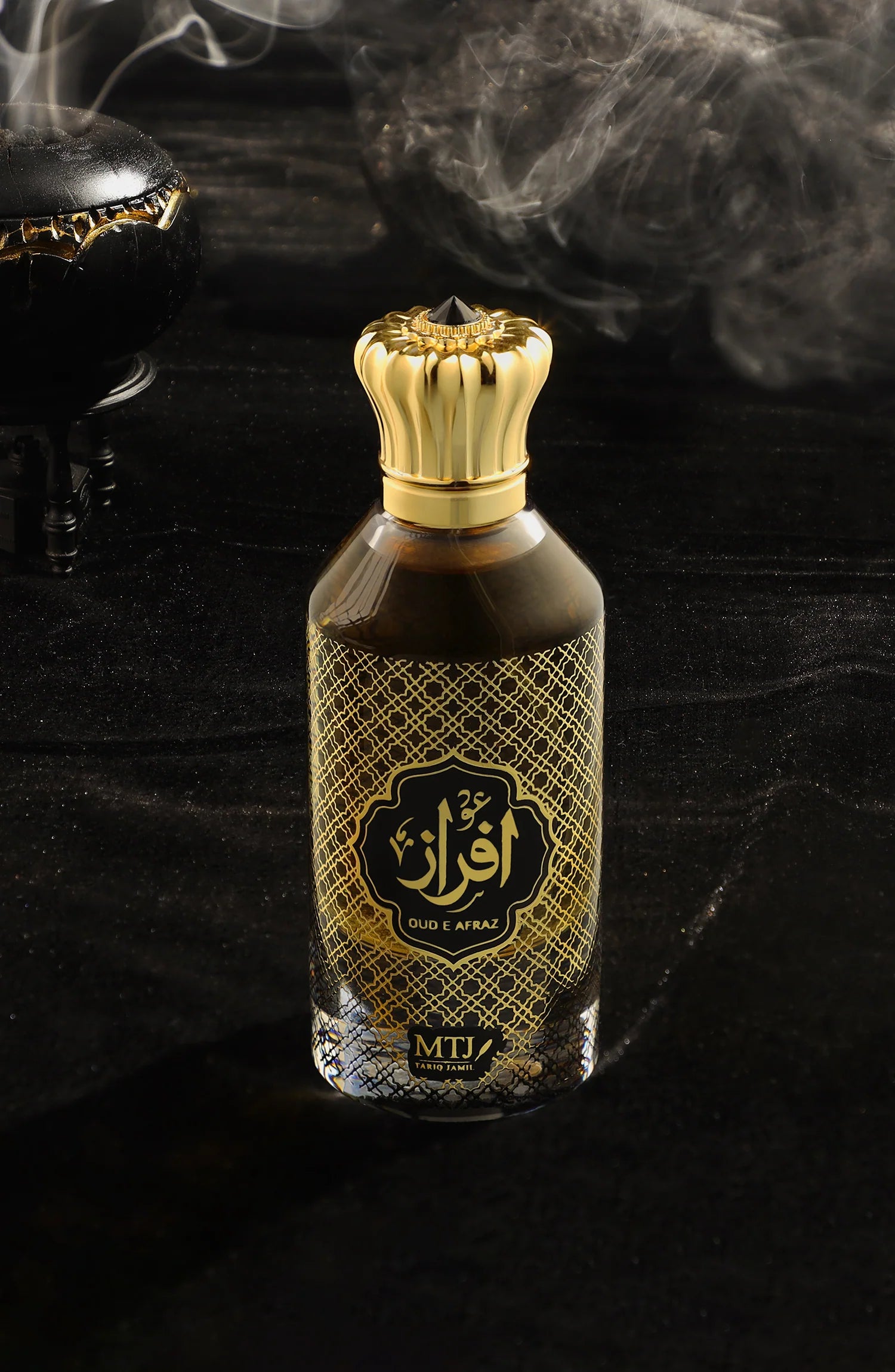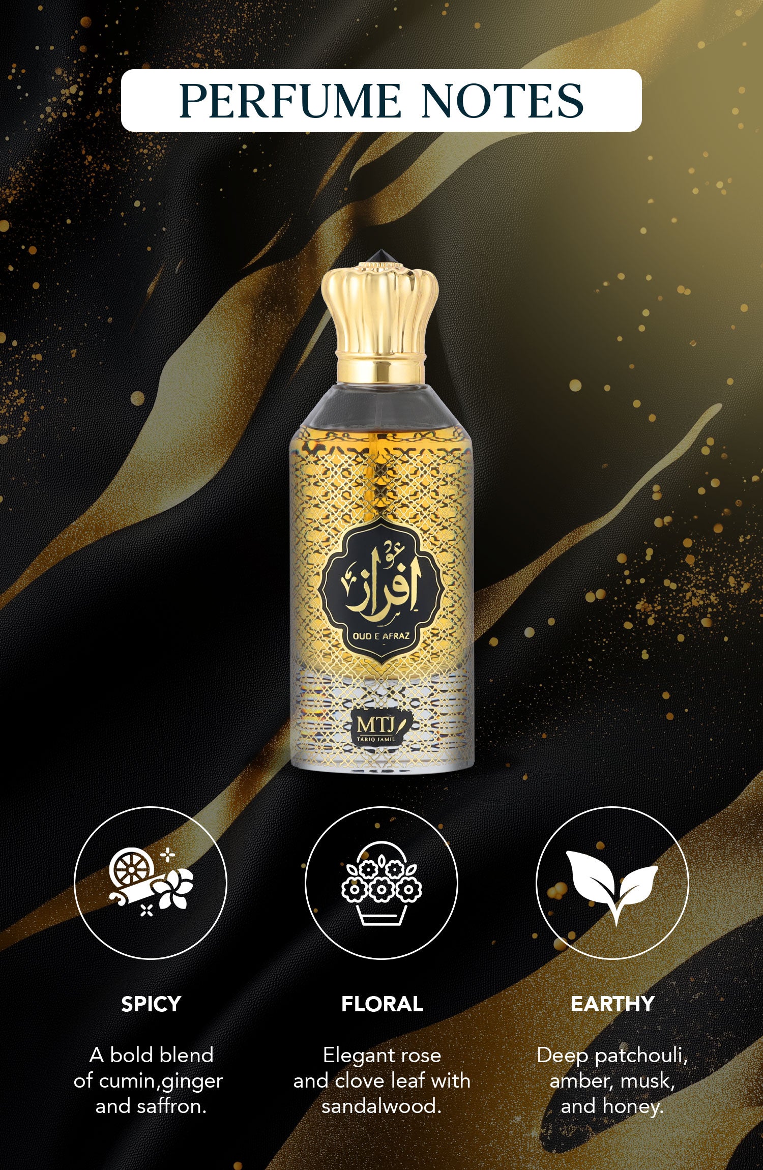 Welcome to the world of MTJ Fragrances, where every scent is a story waiting to be told and every fragrance is a journey of sensory delight. With a rich heritage in crafting exceptional perfumes, MTJ Fragrances is a name synonymous with elegance, luxury, and the art of olfactory expression. MTJ Oud E Afraz, symbolizes a power play of sheer sophistication. A spicy oriental fragrance which brings to mind lavish dinners in the city's grandest high rises. Saffron, the star of the night opens the fragrance alongside strong ginger notes - recalling smart, sharp attire worn at opening theatres. While swaying in sandalwood undertones, the classic red rose sings in harmony with the powerful clove leaf. Opulent patchouli leads the orchestra with hints of mellow honey, elegantly wrapped in musk and amber.