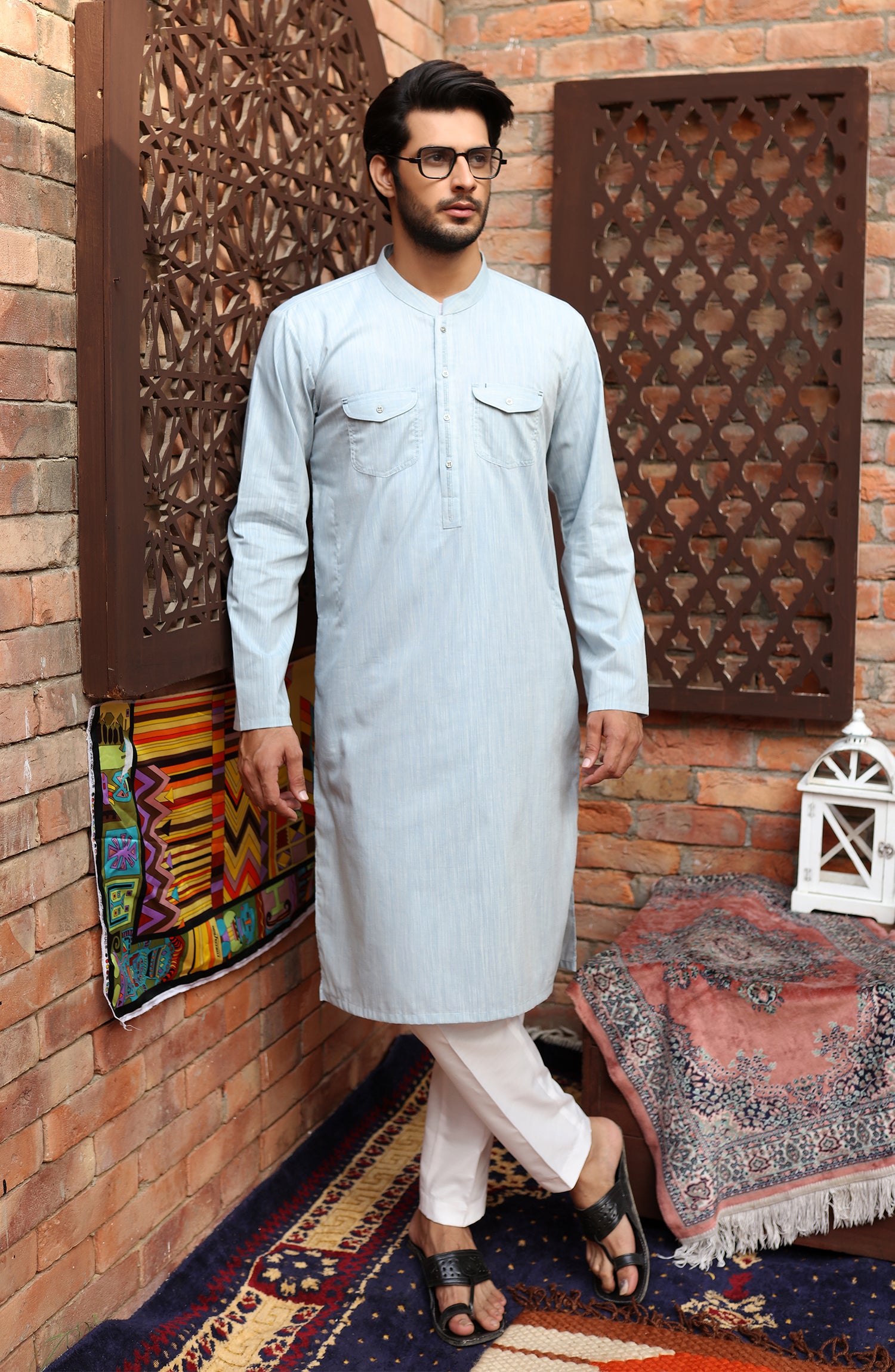 Sky Blue cotton fabric with minor manipulation on placket & elegant detailing on pockets,completed with band collar and round kurta sleeves.