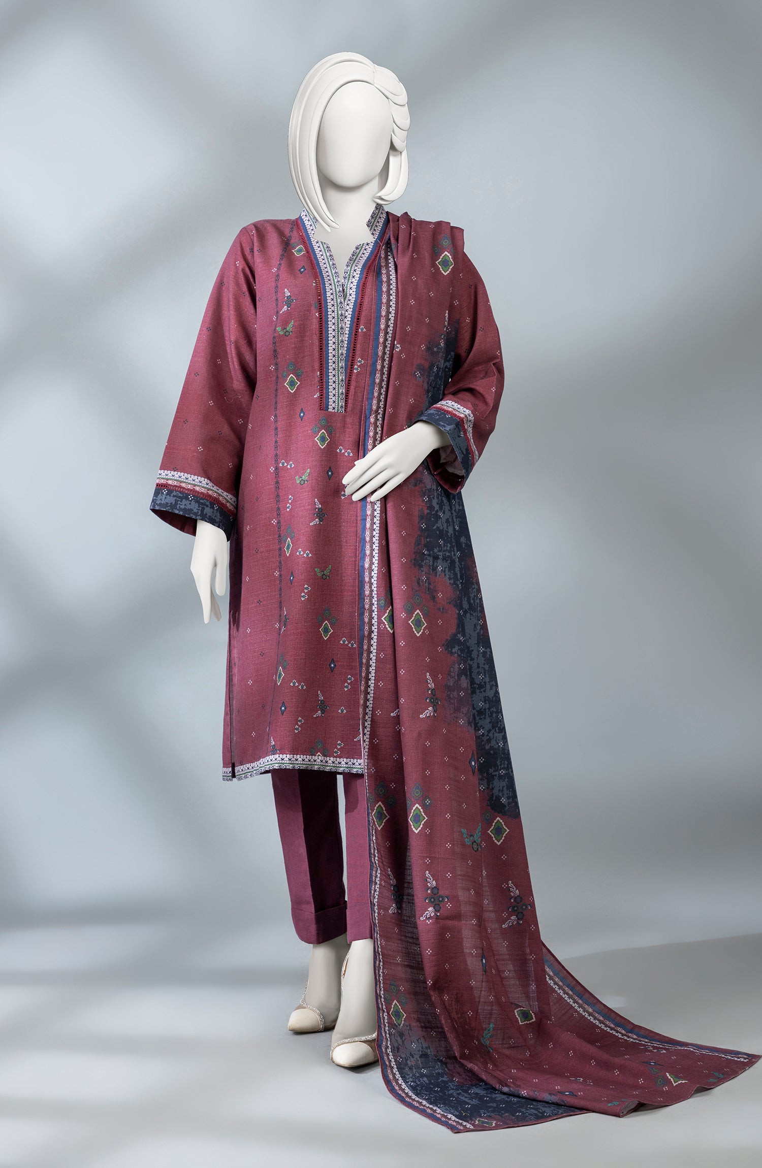 Timeless print, colorful dupatta, stylish trousers – a fusion of tradition and modernity, with a trendy winter color palette. Your ultimate choice for a fashionable and season-appropriate outfit.