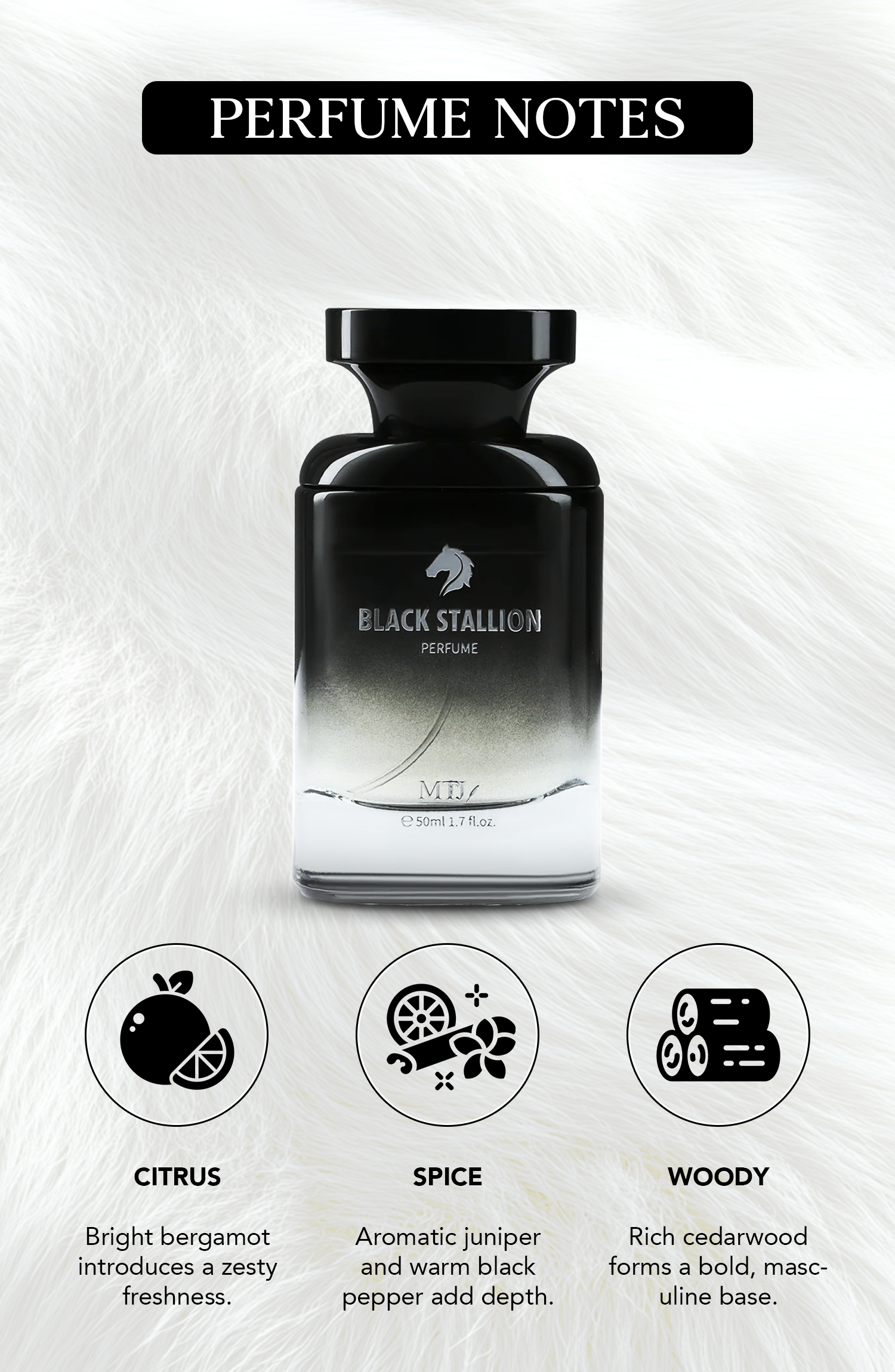 Black Stallion, an adventurous and bold men’s fragrance that captures the essence of power and elegance in every note. This woody spicy scent takes you through a captivating journey, layer by layer: