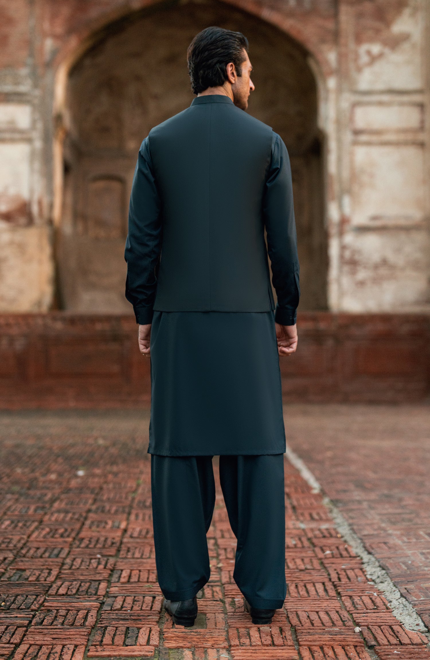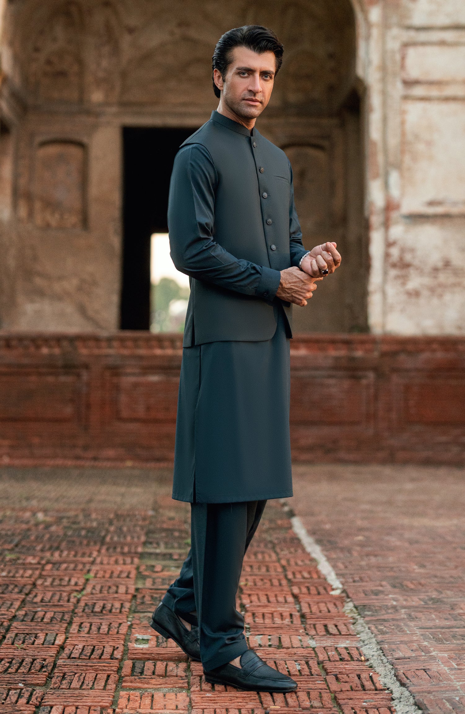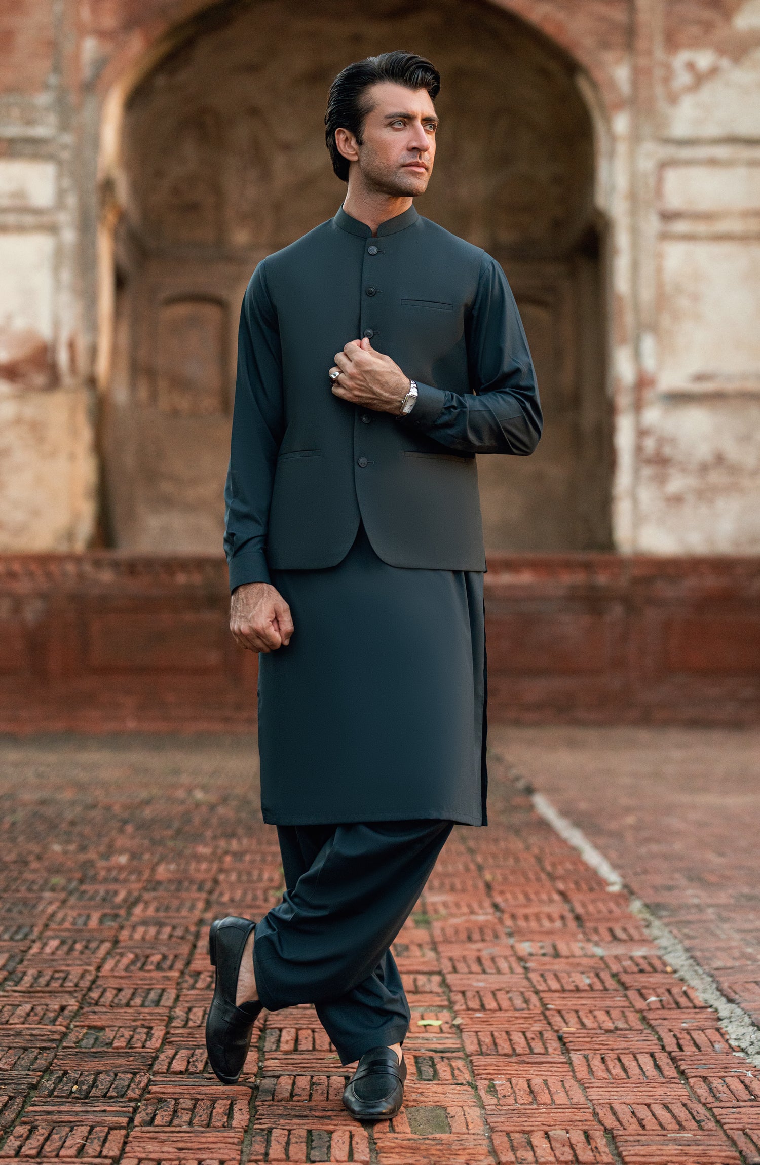 Blended fabric kurta shalwar with an amazing soft and flowy feel and solid color tones, paired with a classy Waistcoat made of Suiting Fabric with slub texture on it, a perfect combination for every occasion whether it’s a formal event, wedding, or festive occasion.