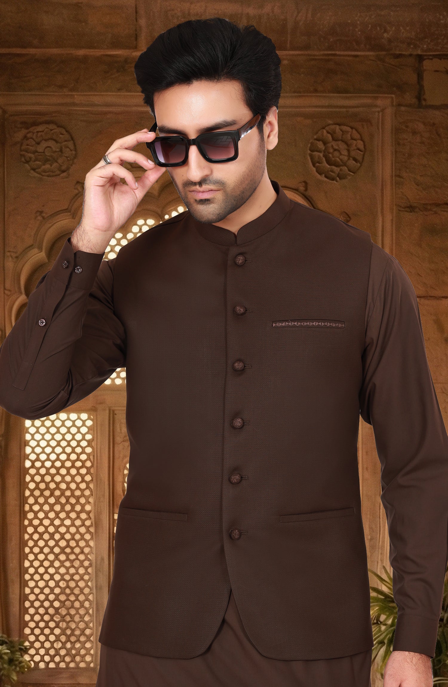 CHOCOLATE-BROWN BLENDED KAMEEZ SHALWAR WITH WAISTCOAT