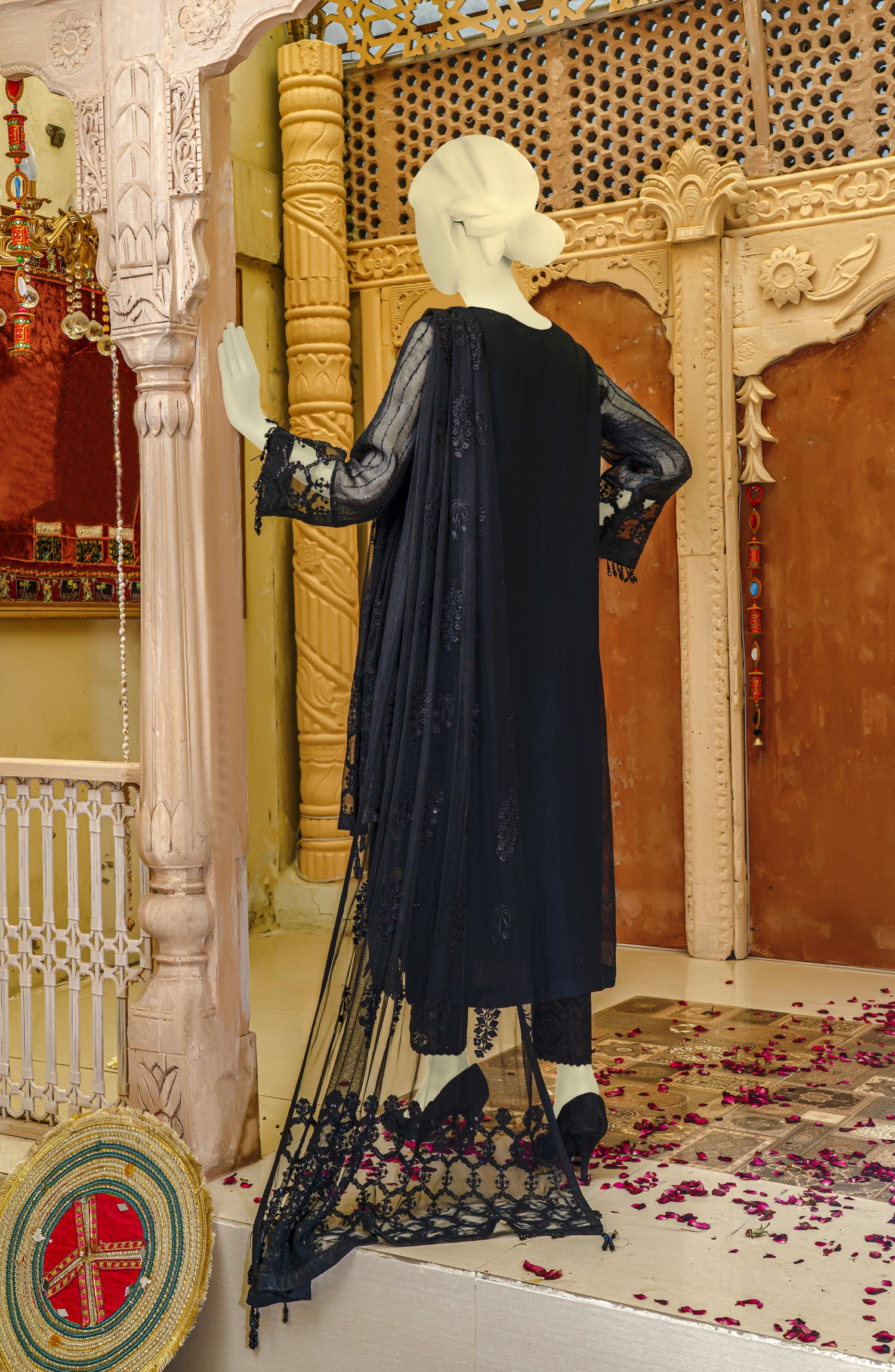 Embellishment: Loop Button on neckline crystal hanging on sleeves, daman and dupatta