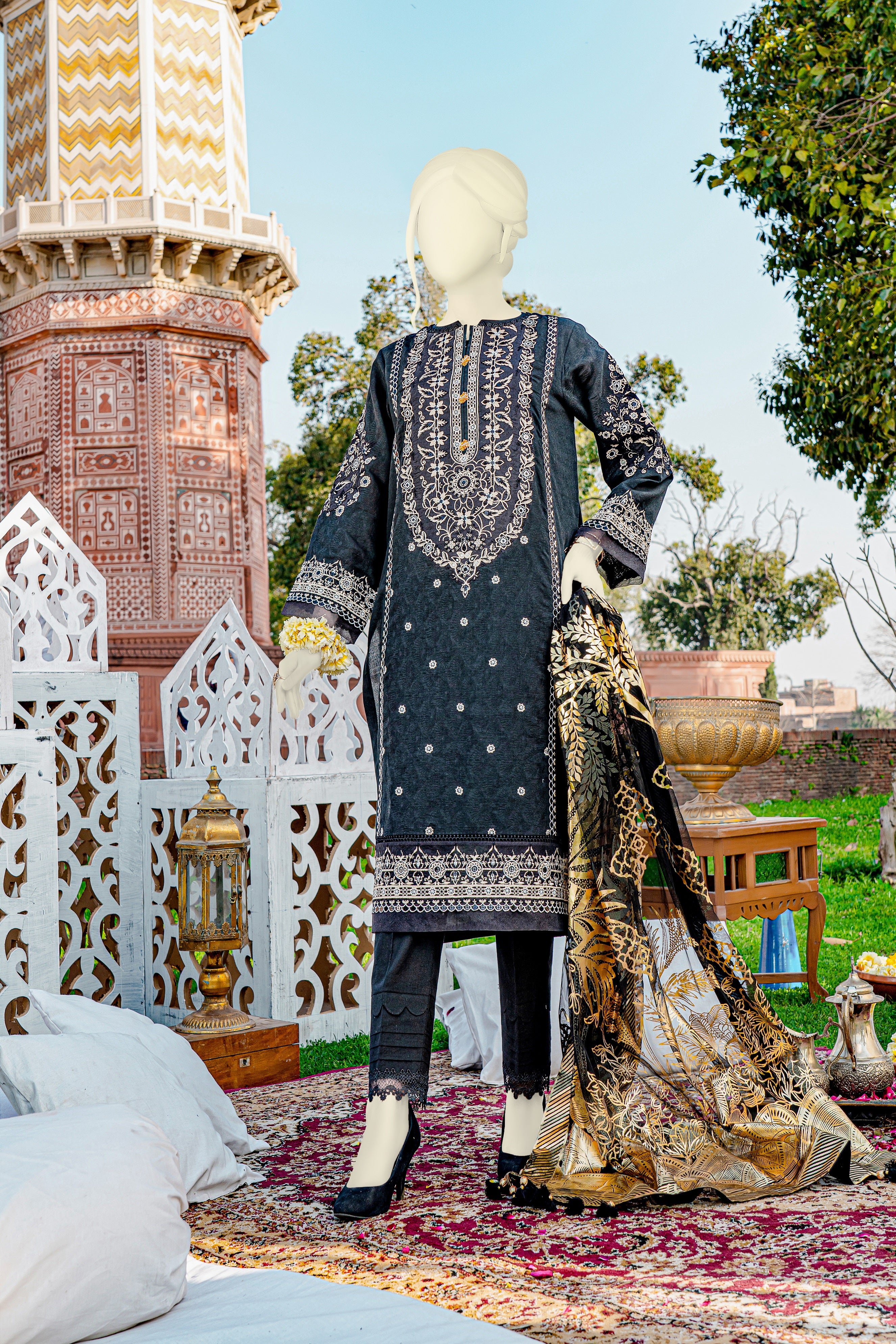 Heavy Embroidered Self Jacquard Shirt With Foil Printed Poly Net Dupatta And Dyed Cambric Pants