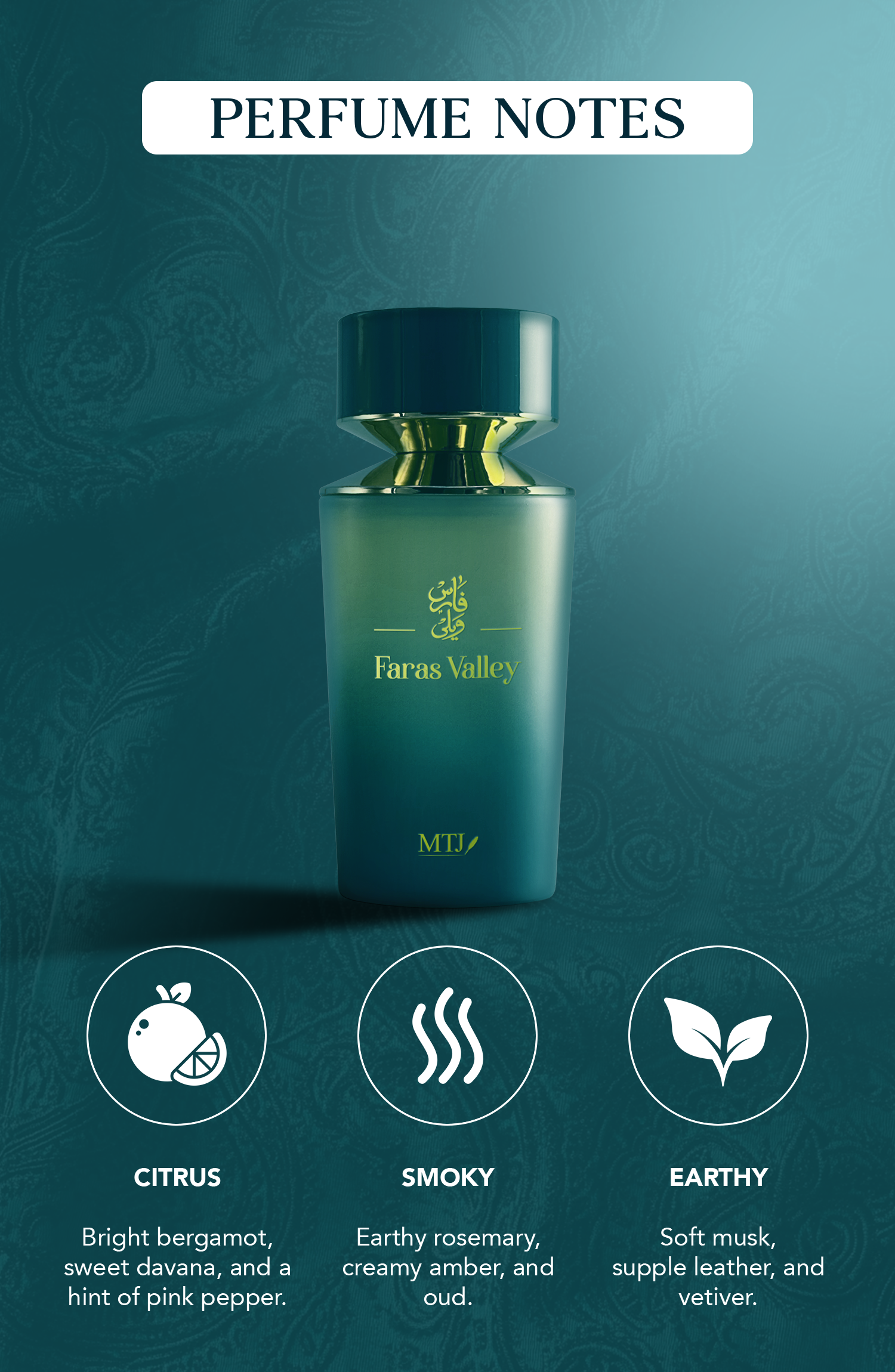 Faras Valley captures the essence of a day's journey from dawn's radiant light to dusk's serene elegance. This enchanting fragrance opens with a vibrant burst of citrus and spices that invigorate the senses, transitions into a warm, smoky heart that exudes sophistication, and concludes with a deep, grounding base that leaves a timeless impression of refined allure.