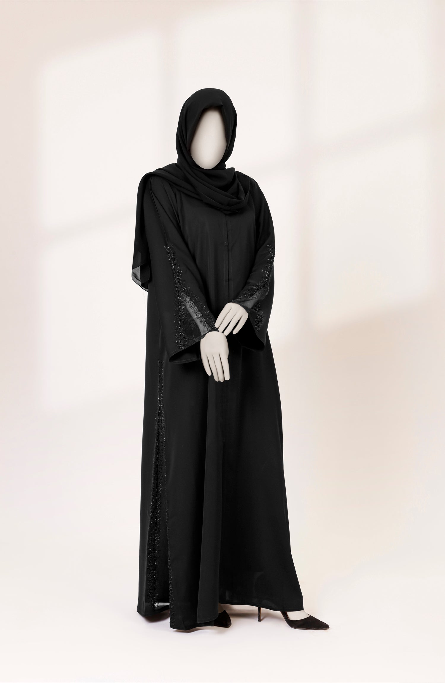 This premium black abaya, crafted from luxurious Nidah fabric, features intricate stonework and lace detailing on organza, offering a perfect blend of contemporary style and traditional elegance. With lace embellishments on the sleeves and side panels, it adds a touch of sophistication, making it an ideal choice for weddings, special occasions, or evening wear. Its exquisite design and comfortable fit make it a timeless addition to any wardrobe. Perfectly paired with a hijab, this abaya elevates your look with class and uniqueness.