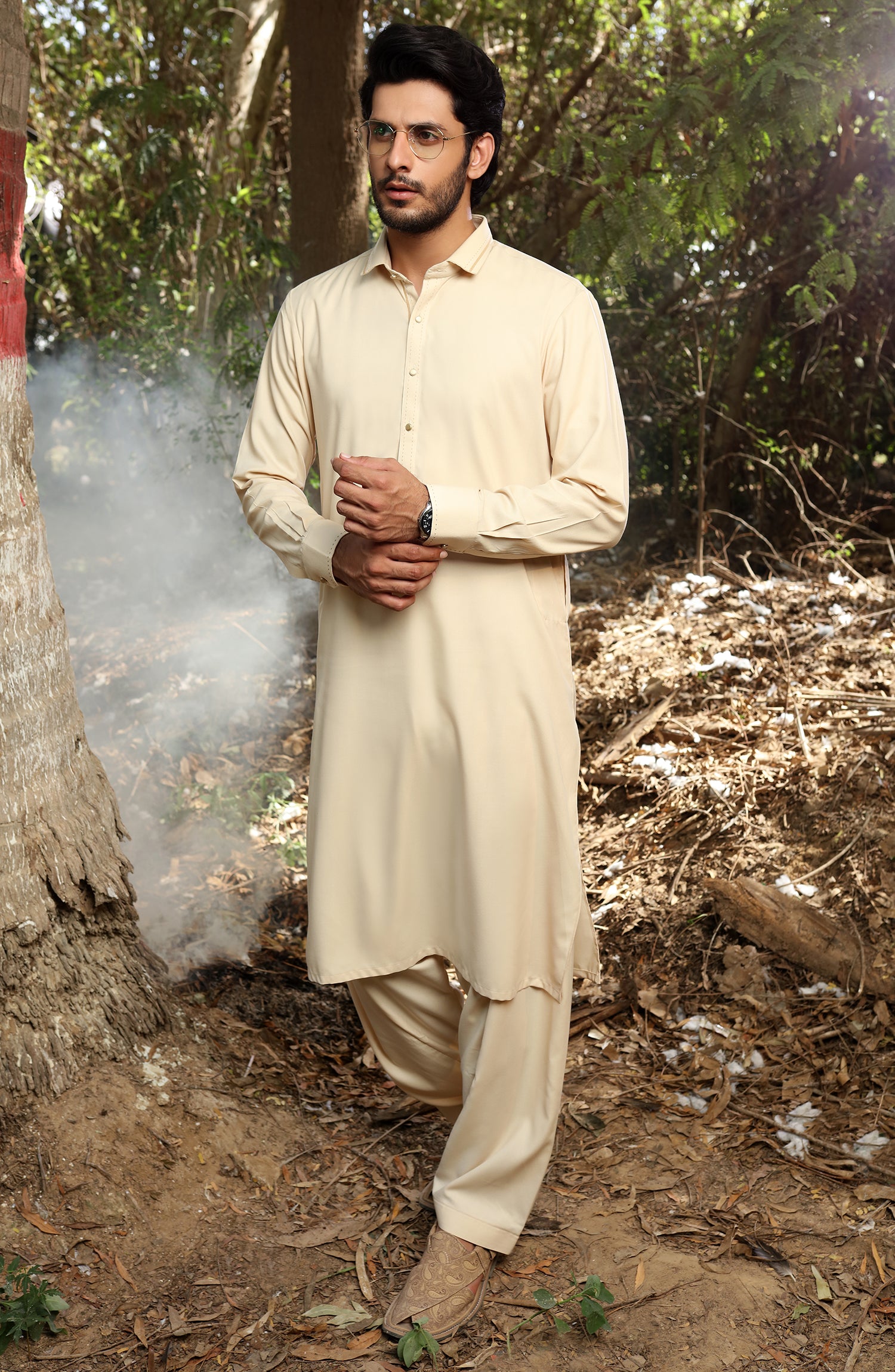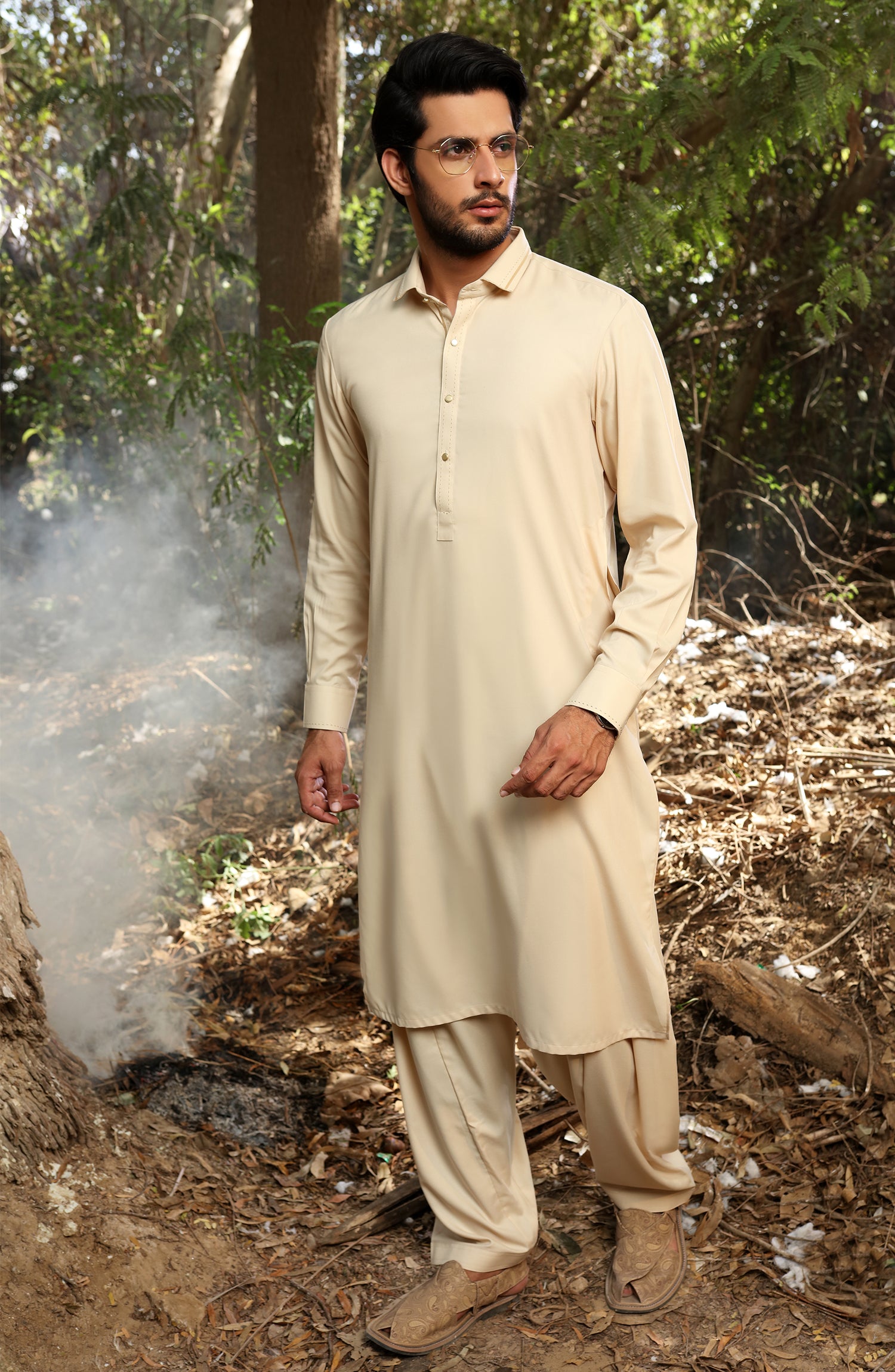 Beige wash & wear kameez shalwar with stitching and contrast details on button take,placket,shirt collar & cuffs.