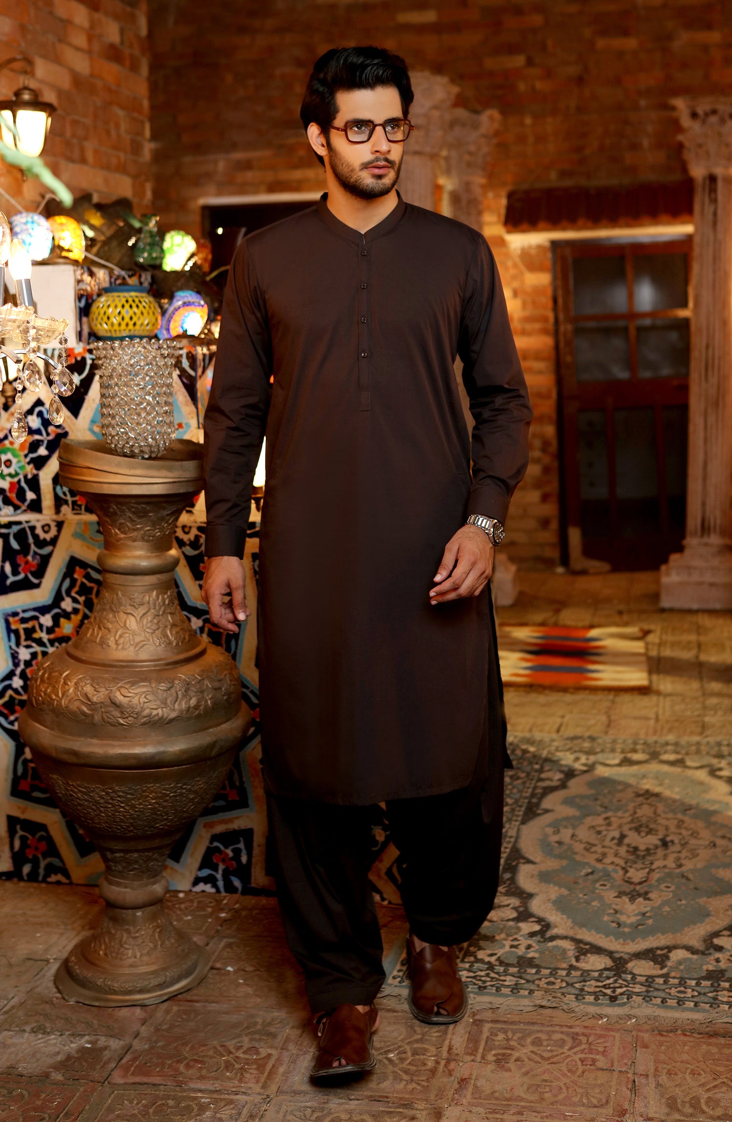 Chocolate Brown plain blended kameez shalwar with plain collar, cuffs added with design element on placket.