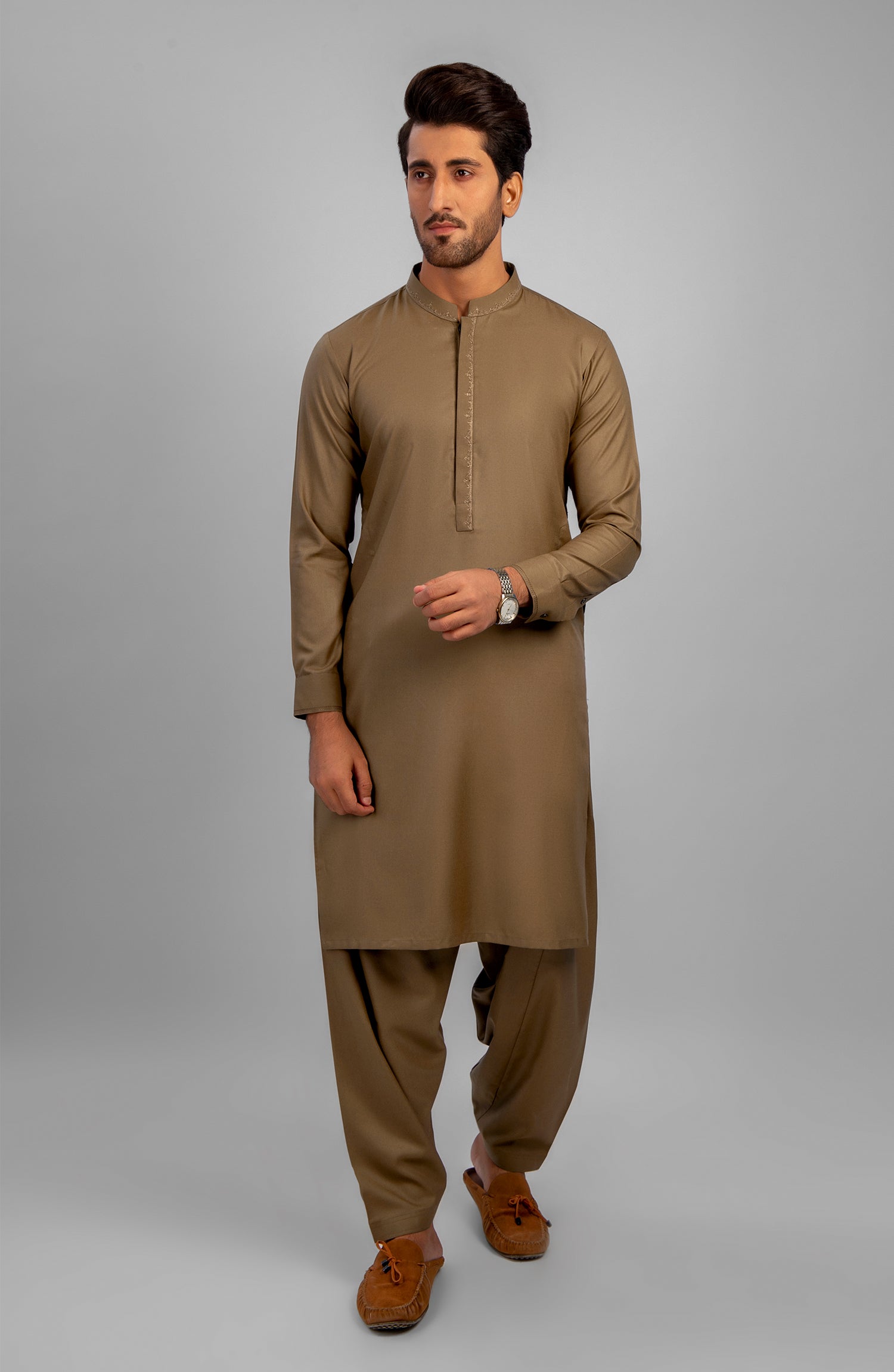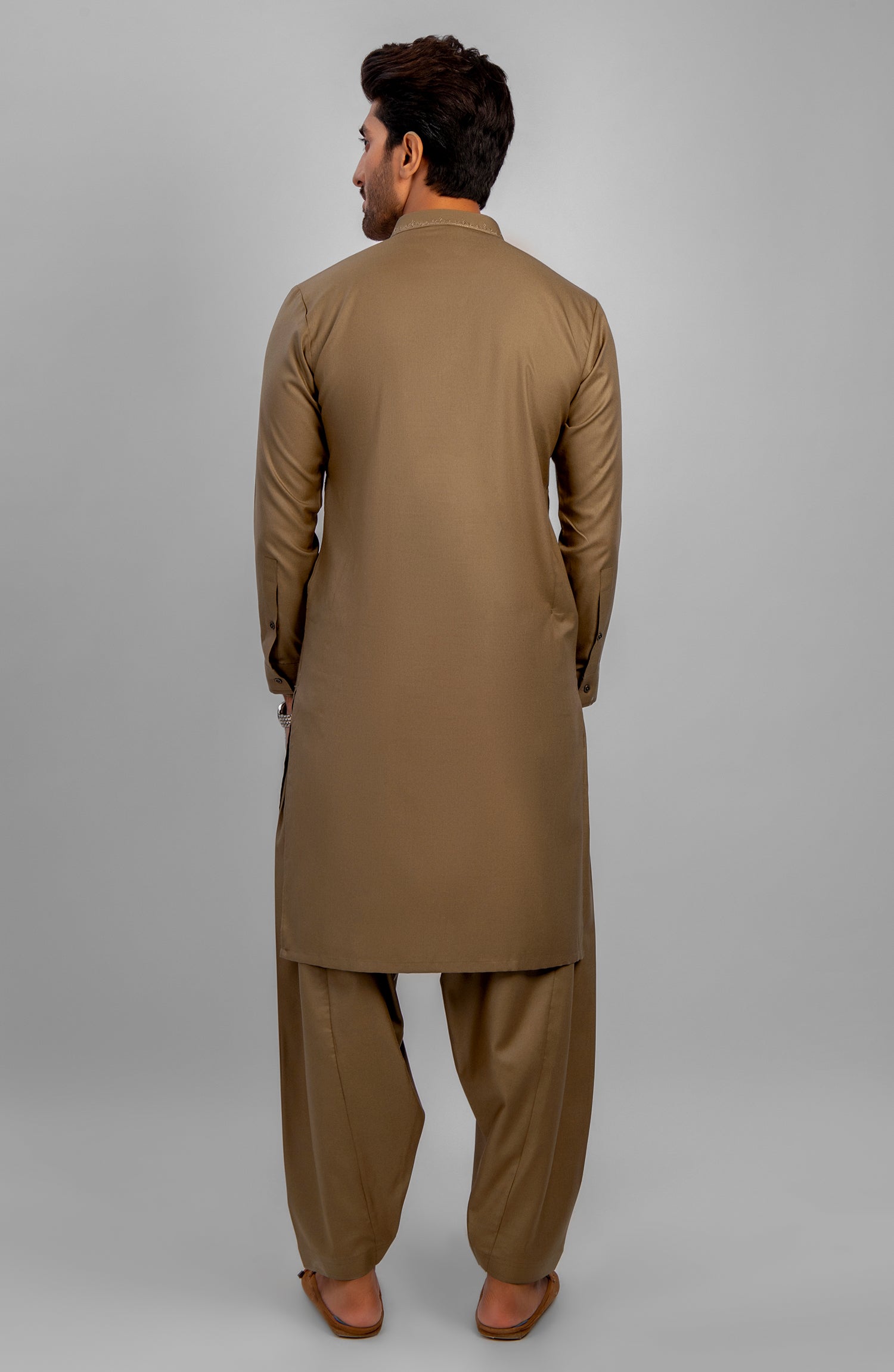 MEN KAMEEZ SHALWAR EMBROIDERED WOOD BROWN