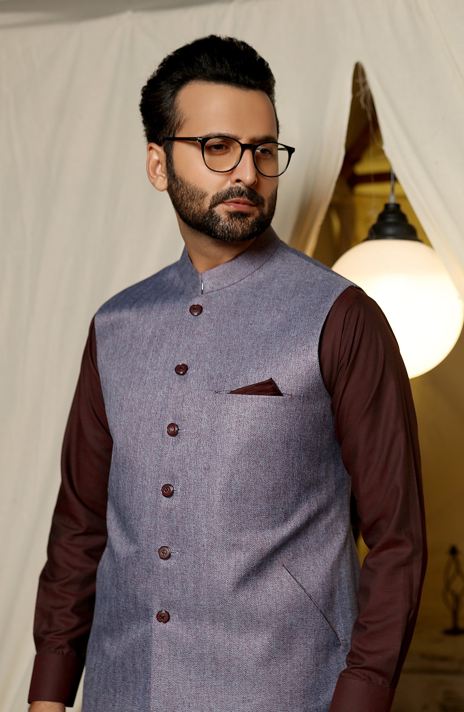 Pastel purple woolen fabric waistcoat with stylized pockets and maroon buttons.