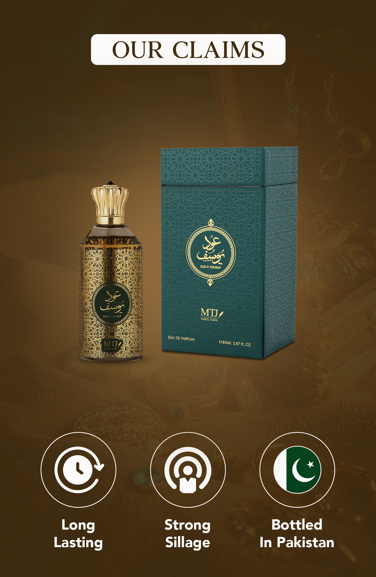 Welcome to the world of MTJ Fragrances, where every scent is a story waiting to be told and every fragrance is a journey of sensory delight. With a rich heritage in crafting exceptional perfumes, MTJ Fragrances is a name synonymous with elegance, luxury, and the art of olfactory expression. MTJ Oud E Yousuf, a rich aromatic oriental fragrance which effortlessly exemplifies burning fierceness and charisma. A gentleman's presence alongside his dame - protective, spontaneous, and alluring. Fresh aromatic lavender blends with bright zests of bergamot opening the fragrance. Charming patchouli and sound Labdanum awaken deep cypriol in the heart, recalling the "chivalrous" acts of one in love. In the background, powerful oud - a noble pillar - is enveloped in airy amber with hints of green oakmoss.