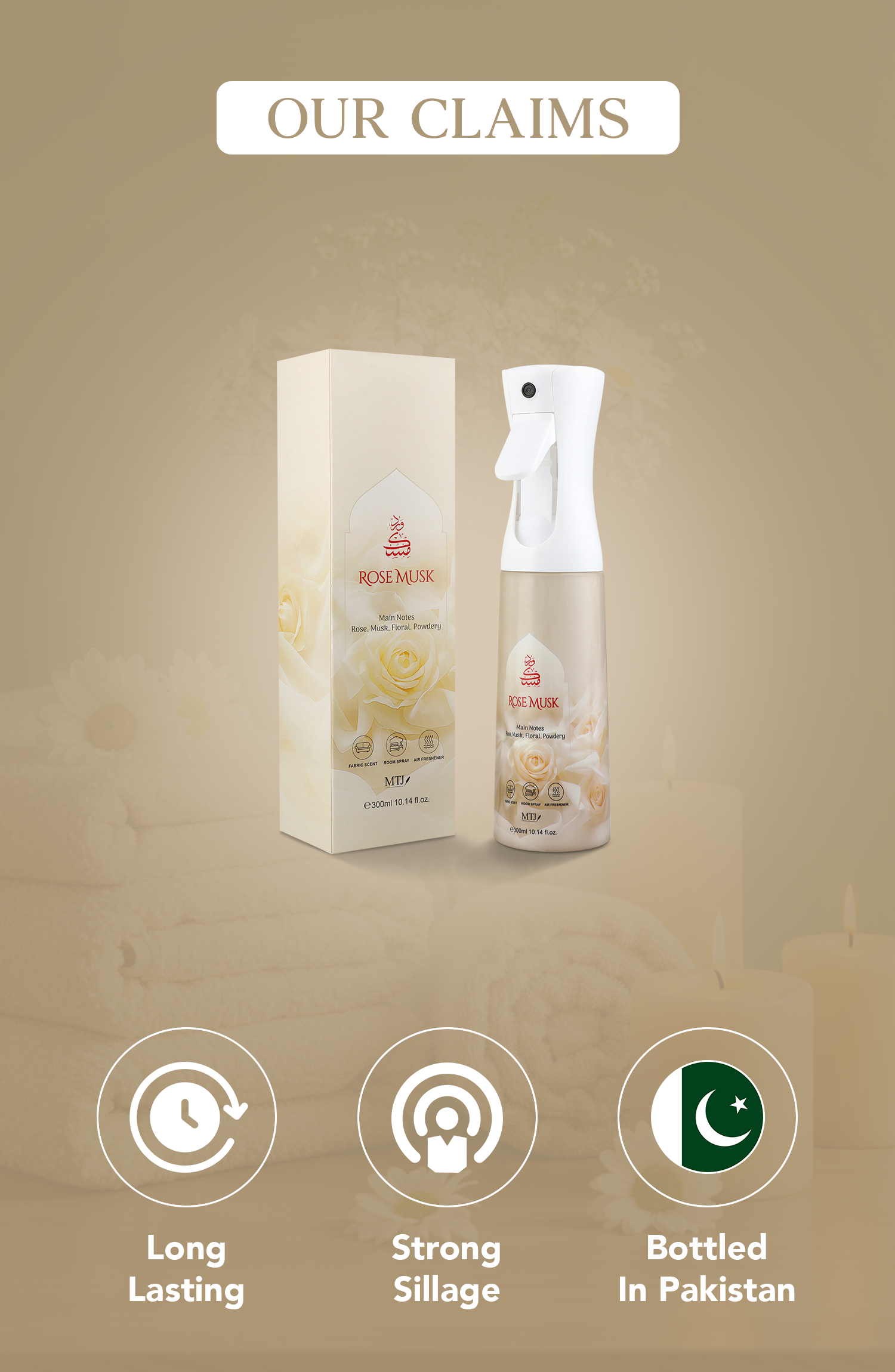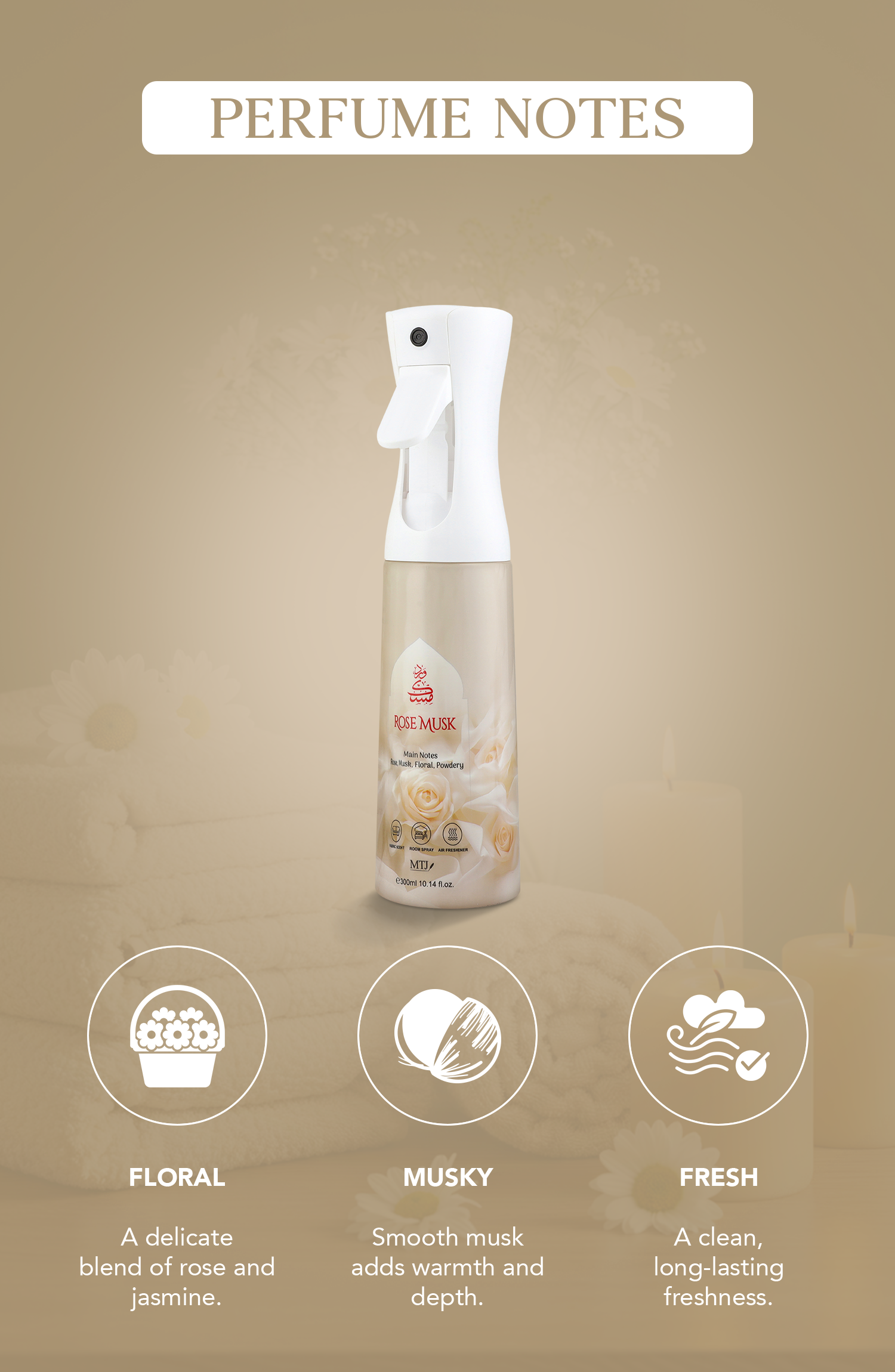 Rose Musk Fabric Scent & Room Spray, a luxurious fragrance that combines the allure of rose and musk with the freshness of jasmine. Elevate your living spaces with its gentle yet long-lasting aroma while benefiting from the product's standout features: