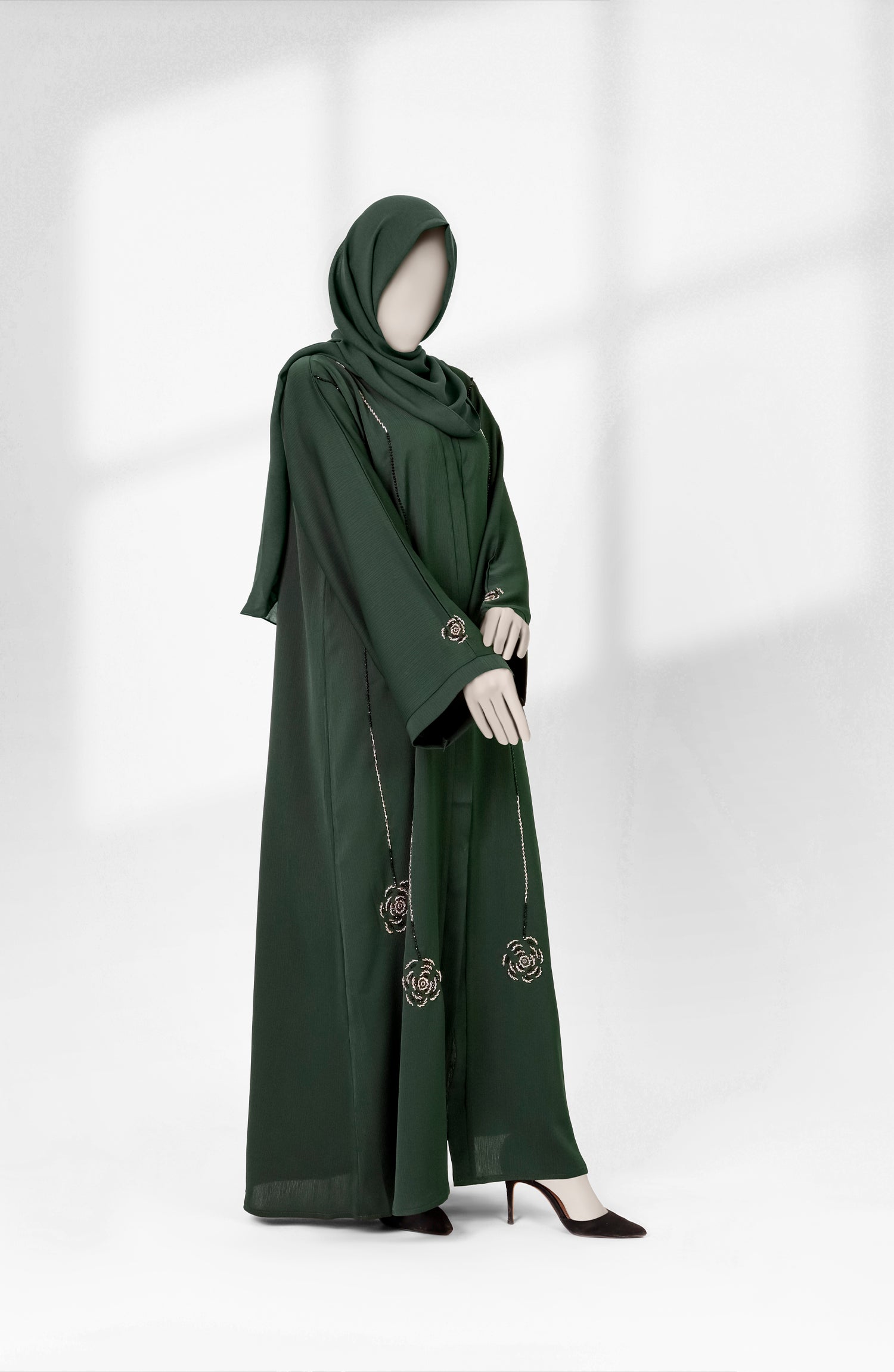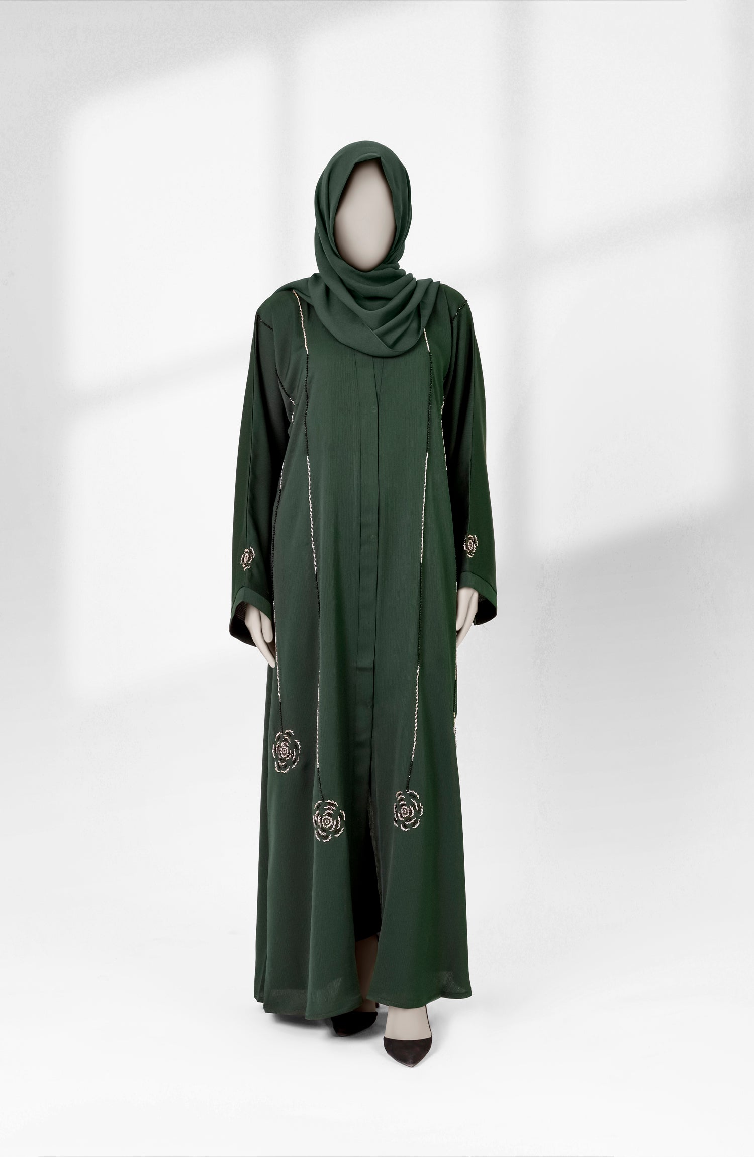 This premium abaya combines modern luxury with traditional elegance. Its front-open design features delicate rose embroidery in black and gold stone-cut Dana, adorning the front and sleeves. The rich emerald green fabric enhances its regal charm, making it perfect for weddings or special events