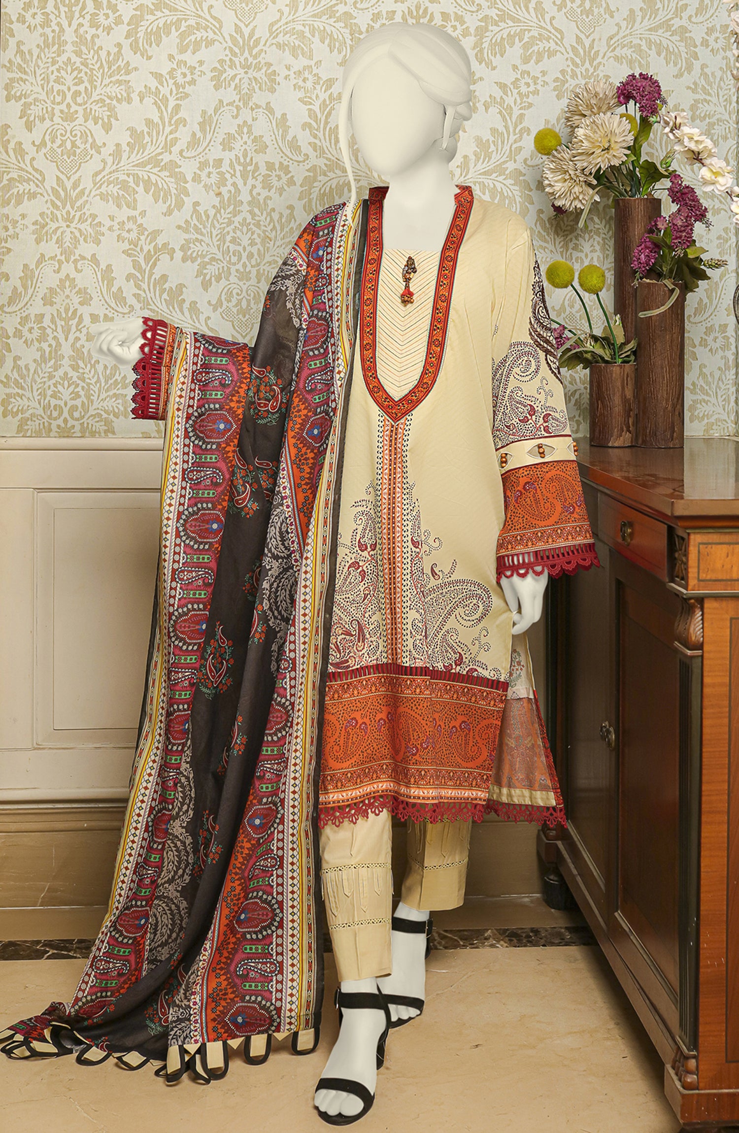Embroidered digital printed lawn shirt with digital printed lawn dupatta and solid dyed pants