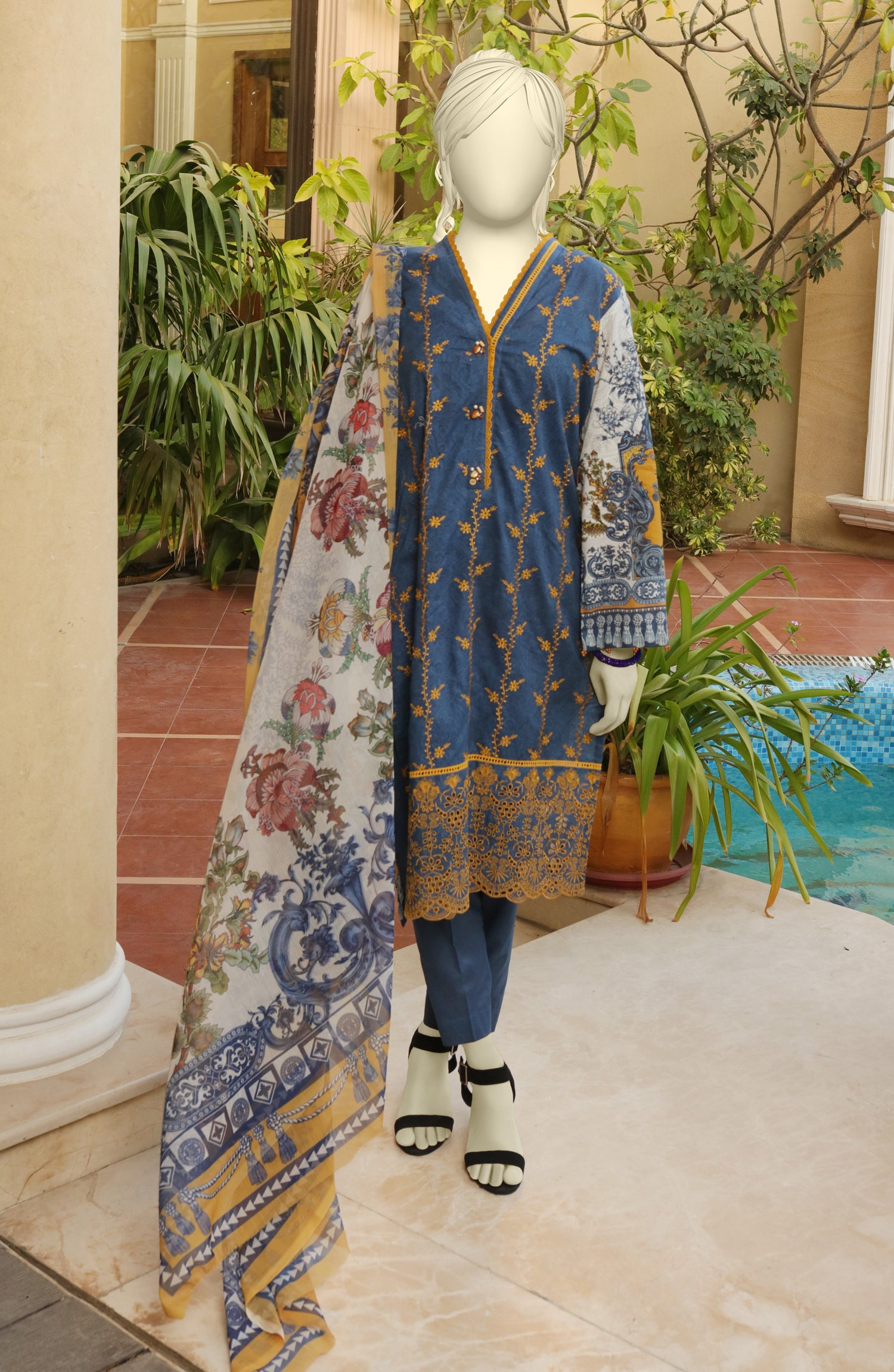 Printed Schiffli shirts with Bamber Chiffon Dupatta and mill printed pants