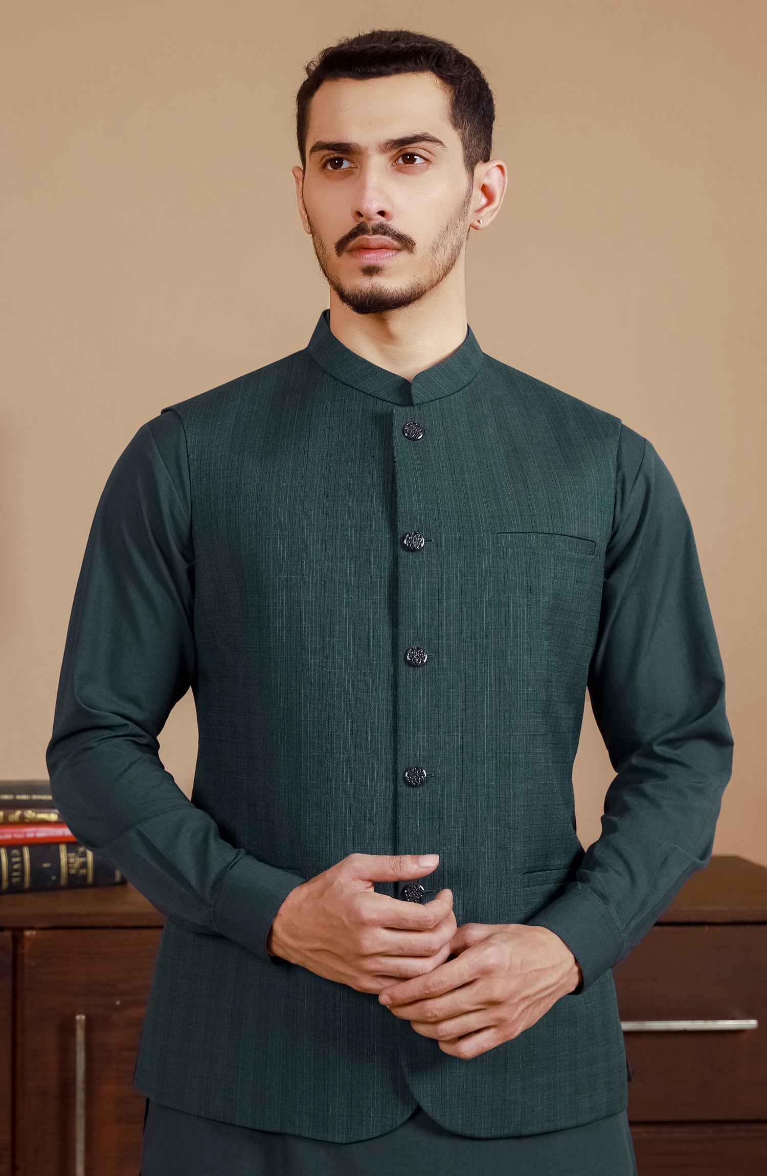 Blended fabric kurta shalwar with an amazing soft and flowy feel and solid color tones, paired with a classy Waistcoat made of Suiting Fabric with slub texture on it, a perfect combination for every occasion whether it’s a formal event, wedding, or festive occasion.
