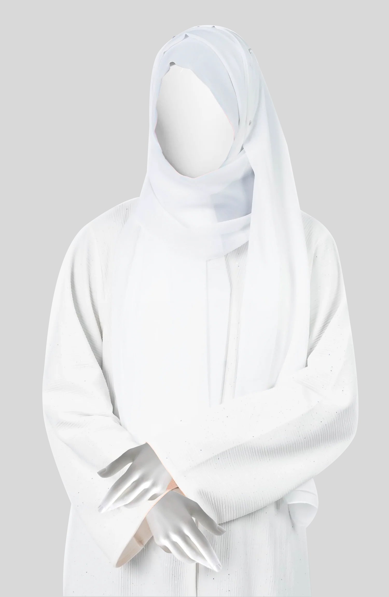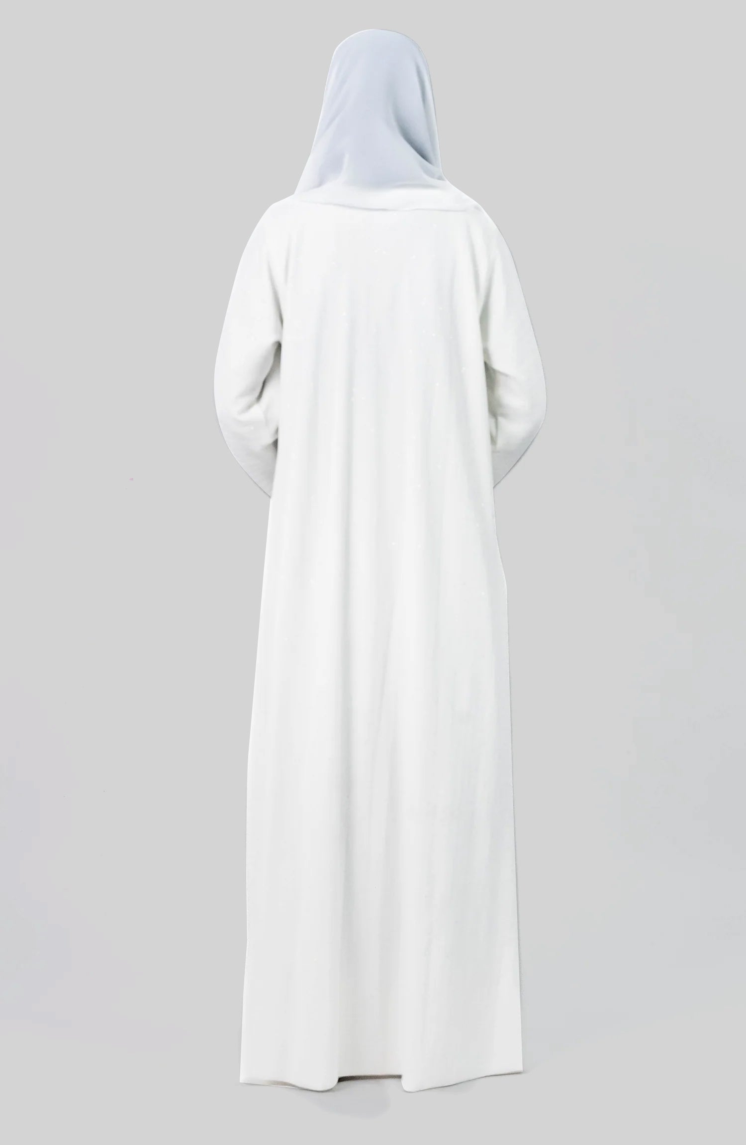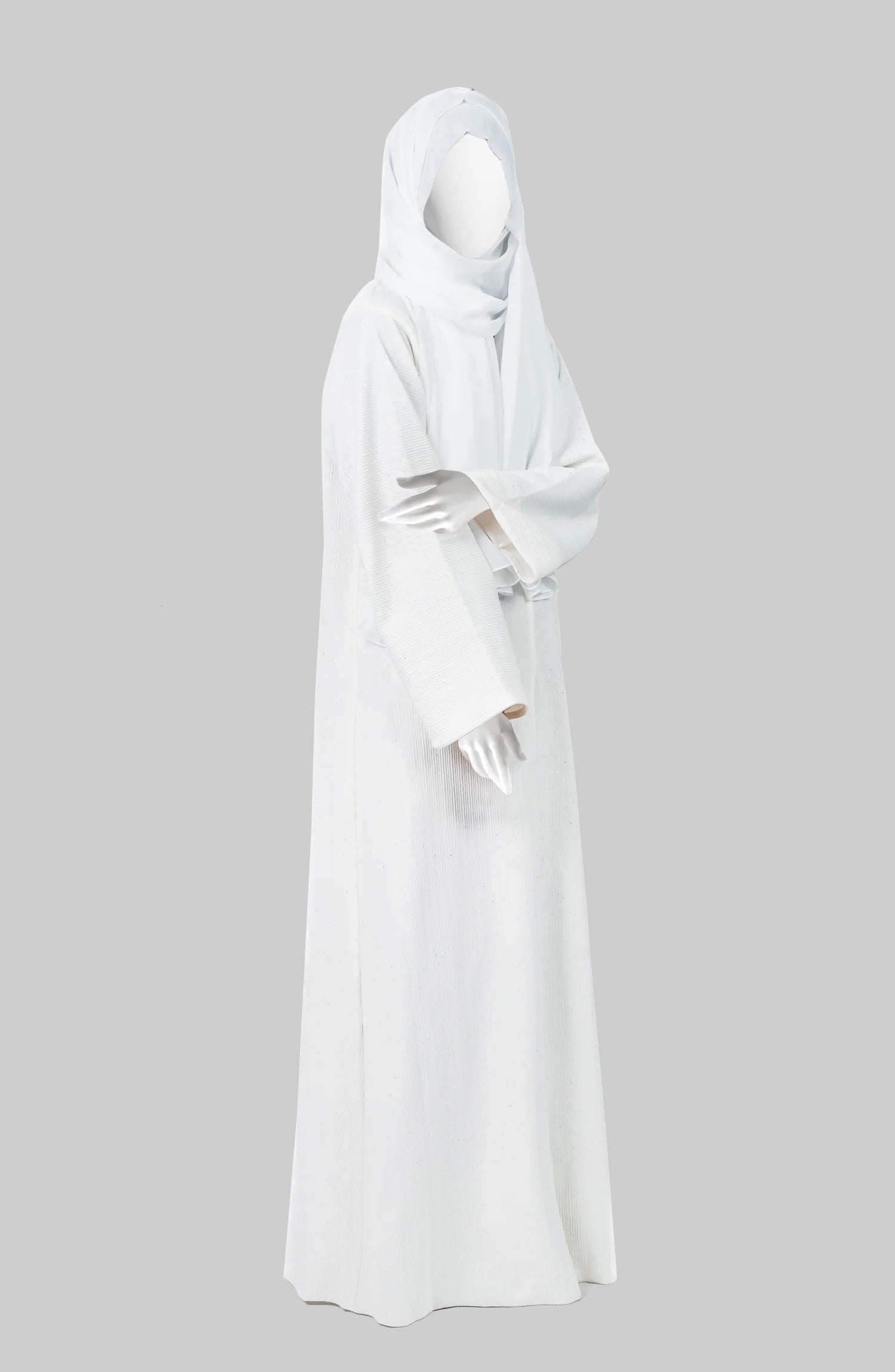 The White Shimmer Abaya is a beautifully designed Straight Arabic style abaya, featuring a button-down front that allows for easy opening and closing. Made from cotton jersey with shimmer, this unique fabric adds a touch of elegance while maintaining a sleek and flowing fit. The abaya’s self-design lines create a subtle crushed look, enhancing its sophisticated appeal. For the best styling, it pairs perfectly with contrasting inners, and wearing an inner slip is recommended for a more polished finish. Ideal for travel, evening outings, or special occasions, this abaya ensures both comfort and style. It also comes with a matching Sheila, completing the look effortlessly.
