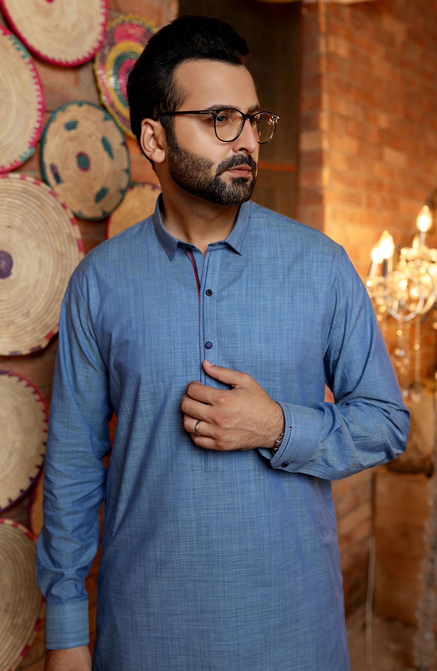 Blue Yarn-Dyed cotton kameez shalwar with design manipulation on shirt collar, placket, button take & cuffs.