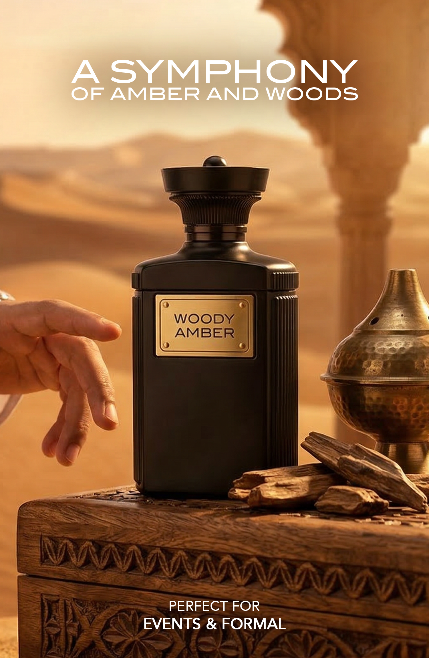 The fragrance concludes with a warm amber base layered with earthy woods, creating a comforting yet powerful finish.